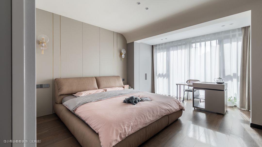 次卧延续整体简约设计,奶茶色+浅粉色烘托出静谧舒适的睡眠氛围,以纯净的浅咖色为基底,精致的水晶壁灯点亮都市蜗居的好心情,营造出家的温情感。 次卧保留了落地窗搭配纱帘,布置上奶油灰色的多功能伸缩小茶桌,办公喝茶可以同时使用,蒙拉丽莎的岩板桌面耐用易清洁,白天收起茶炉,也不怕小朋友来捣乱了,打造出一个舒适休闲的小角落。