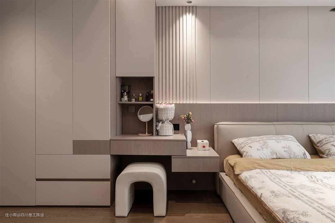 主卧空间颇有氛围感,床头的位置做半墙设计,且加入嵌入式灯带进行装点,视觉效果十分美观还增加空间隔音,床侧和床尾都做了柜子,兼顾实用与美观。