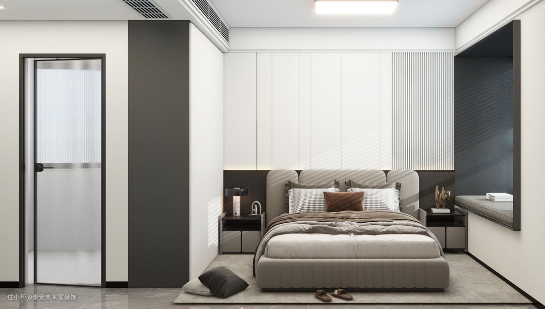 主卧内的家具布置简洁大方,黑色床头柜、白色床架与灰色窗帘的搭配,体现了现代简约风格的简洁与时尚。 深灰色床头背景墙与浅灰色床单的对比,营造出一种温馨而宁静的氛围。同时,黑色和灰色的元素也贯穿整个房间,使得空间显得沉稳而有质感。 床头背景墙的设计采用了直线和几何形状,创造出一个简单而有条理的空间感。这种设计减少了视觉杂乱,强调了空间的功能性和实用性。 主卧内融入了一些装饰元素,如墙面挂画和小物件,整个空间增添了一丝个性化的色彩。