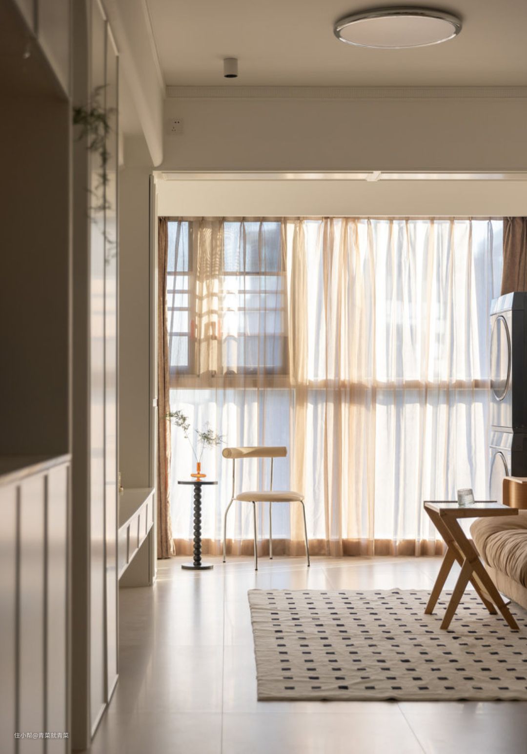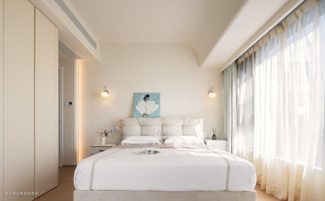 主卧墙顶柜子都是可可蛋奶的颜色,再加上极佳的采光,超级的温馨, 主卧此处有一个大柱子,但是不想大尖角对着床,所以也是做圆弧,同时可以内嵌一 个小薄柜子,放些零碎的小物件