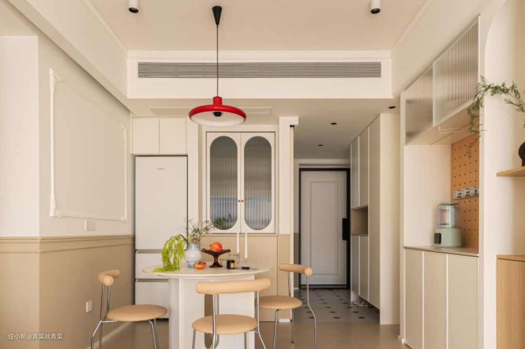 1:厨房设计一个对着餐厅的地柜,上方做折叠窗能看到客厅的视线 2: 玄关进来一排的柜子,鞋柜+餐边柜+储物柜+电视柜一体 3:公卫干湿分离,台盆外 置,台盆对面借了一点次卧的墙体,内嵌一个家政柜 4:主卧衣柜延着卫生间墙体做 一排,不遮挡两边窗户,让主卧采光最大化