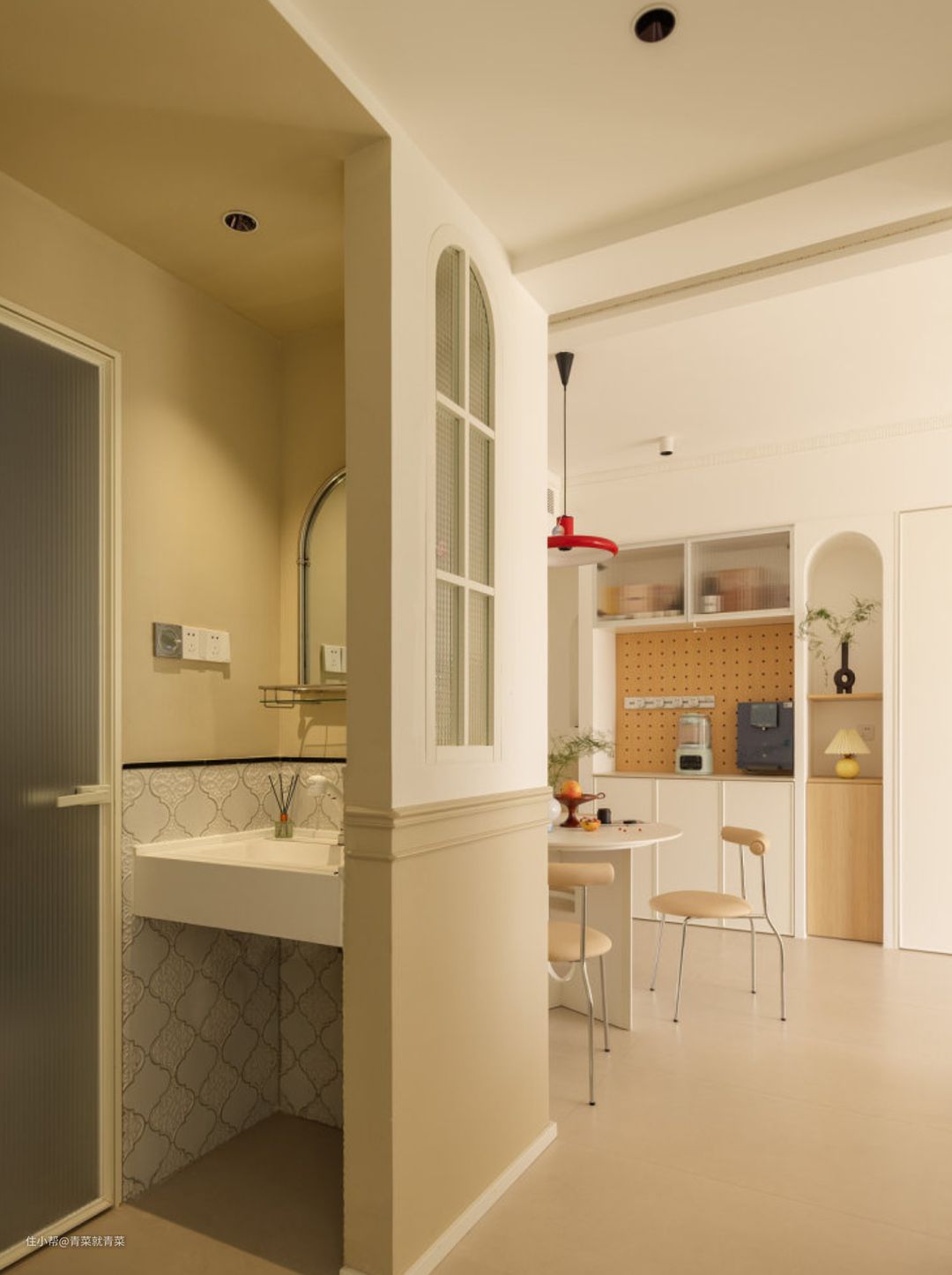 公卫干区台盆,异形花砖铺贴半墙,圆拱透明玻璃隔断做造型