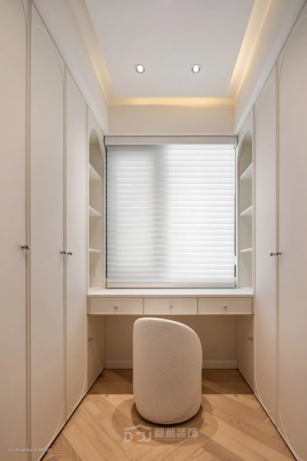 主卧的整体设计以暖色调为主,营造出一种温馨舒适的休息环境。软包床头和边缘圆角处理的床头柜,使整个卧室的线条更加柔和,给人一种温暖的感觉。 在卧室的设计中,大量的圆弧形处理减少了尖锐物品的存在,这在一定程度上保证了孩子的安全。例如,床头柜的圆角设计可以防止孩子意外碰撞,而软包床头则减少了孩子可能遇到的硬物伤害。 衣帽间两侧的白色通顶衣柜,不仅增加了收纳空间,还保持了卧室的整体风格。通顶的设计使得衣柜能够最大化地利用垂直空间,提供更多的储物空间。而白色的衣柜与卧室的暖色调相得益彰,使整个空间看起来更加整洁和宽敞。 靠窗的梳妆台,则为业主提供了一个可以独处的小空间。在这里,业主可以享受安静的时光,进行日常的护肤和化妆。梳妆台的设计可以考虑加入一些抽屉和隔板,以便于存放各种化妆品和饰品,让这个小空间保持整洁有序。