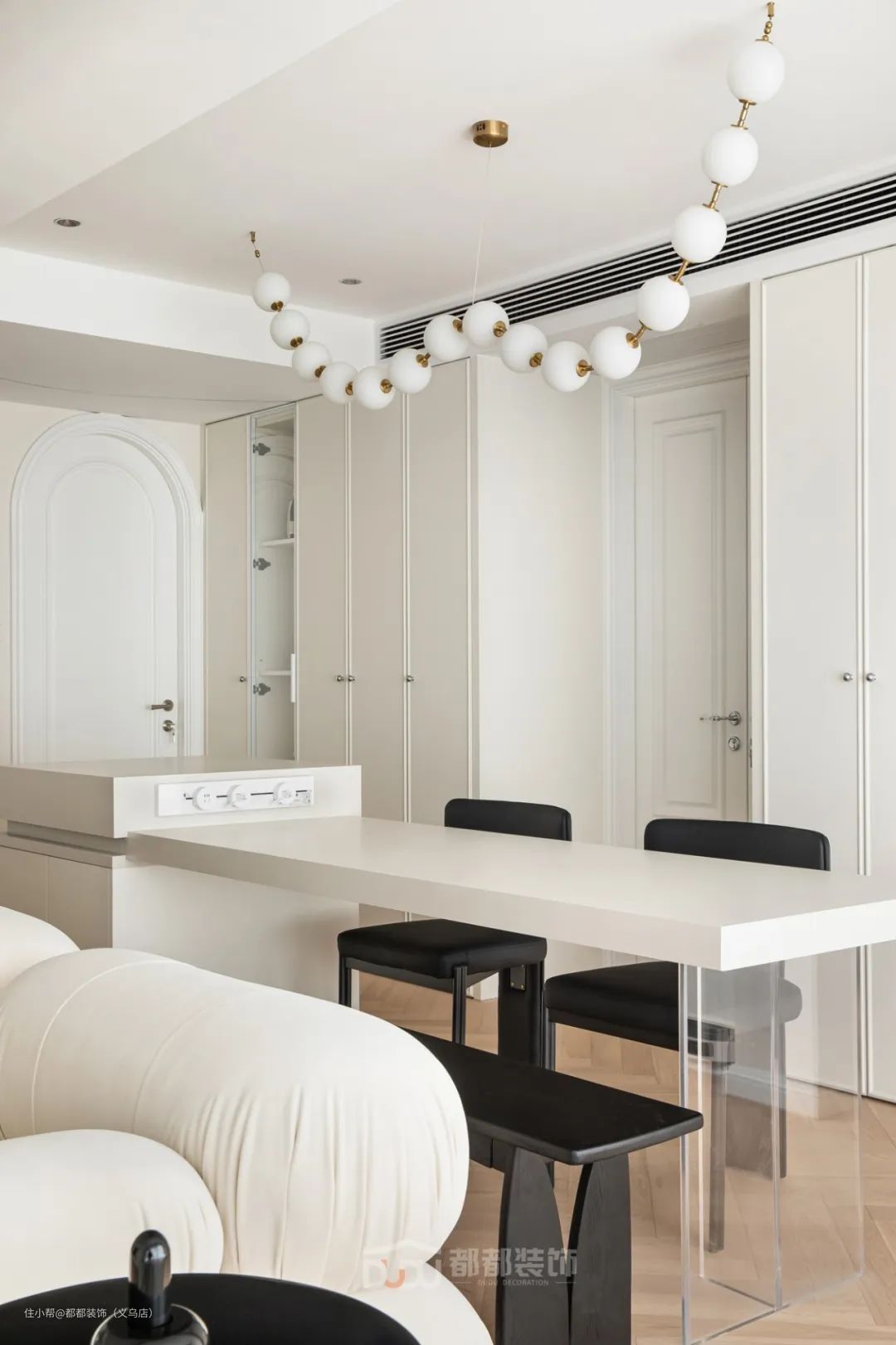 开放式多功能区域与客厅融为一体,打破了传统空间的隔断,让整个居住环境更加通透和宽敞。这种设计不仅增加了客厅的视觉空间,还促进了家庭成员之间的互动交流,特别是对于有孩子的家庭来说,这样的布局更能促进亲子互动。 长条形多功能桌成为了这个区域的核心,它不仅能够满足家庭聚会的需求,还能成为孩子们学习和娱乐的平台。桌子的设计考虑到了实用性和美观性,亚克力透明桌腿为空间注入了轻盈的空气感,同时又不占据视觉空间,让整个区域看起来更加宽敞。 白色石材桌面与黑色长条凳的搭配,展现了简约而现代的设计风格。这种纯粹的色彩搭配,不仅符合现代审美,还让整个区域散发出一种高级感。墙上打满柜子的设计,充分利用了垂直空间,大大增加了收纳功能。这些柜子可以是封闭式的,用来存放不常用的物品,也可以是开放式的,展示家庭成员的收藏品或者装饰品。