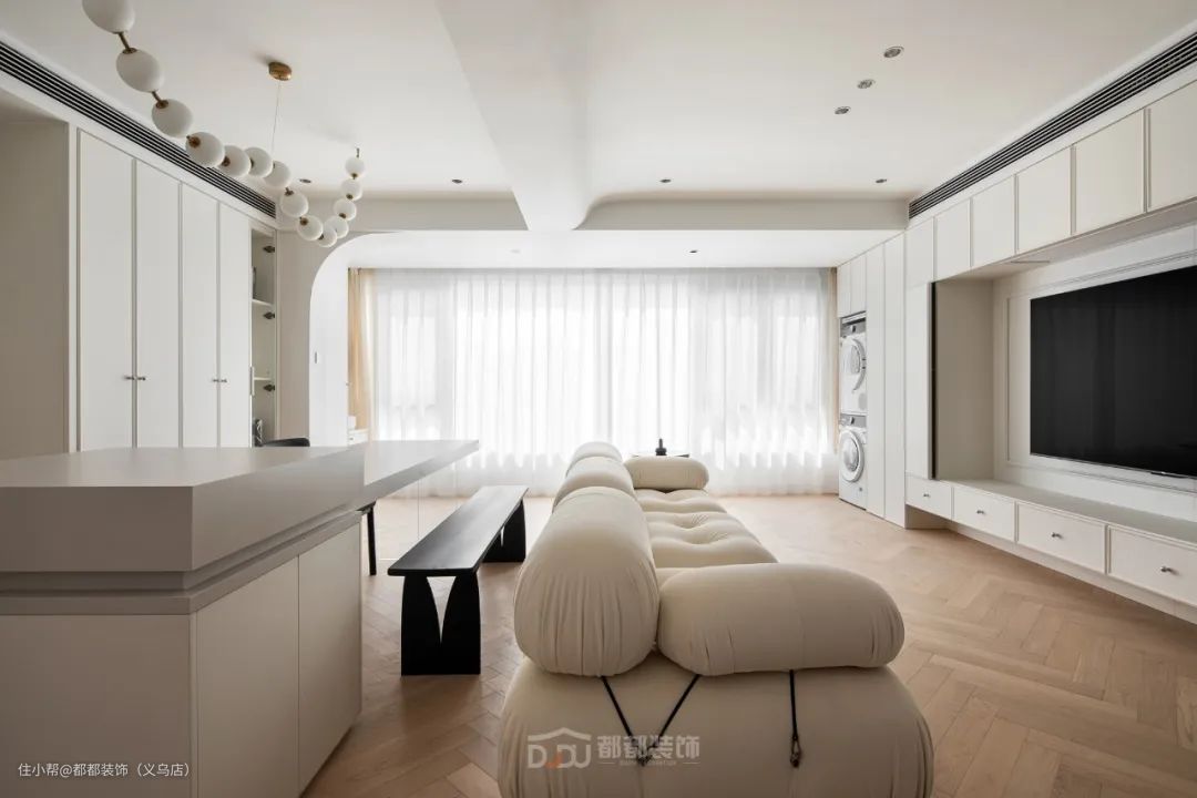 阳台通铺包进客厅的设计,不仅延续了整体的简约法式白风格,还巧妙地将户外景色引入室内,让居住者在家中也能享受到自然的光线和美丽的风景。 两侧的家政区域设计,充分考虑了实用性和美观性的结合。洗烘套机的配置,不仅解放了传统的晾衣区,还让衣物护理变得更加高效和便捷。