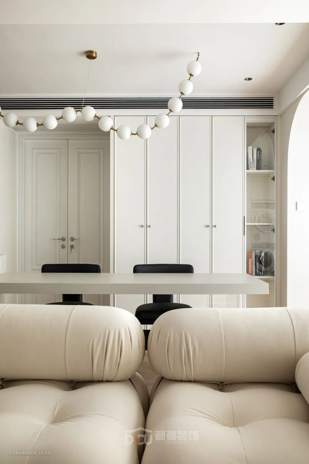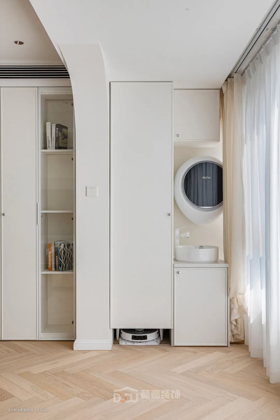 阳台通铺包进客厅的设计,不仅延续了整体的简约法式白风格,还巧妙地将户外景色引入室内,让居住者在家中也能享受到自然的光线和美丽的风景。 两侧的家政区域设计,充分考虑了实用性和美观性的结合。洗烘套机的配置,不仅解放了传统的晾衣区,还让衣物护理变得更加高效和便捷。