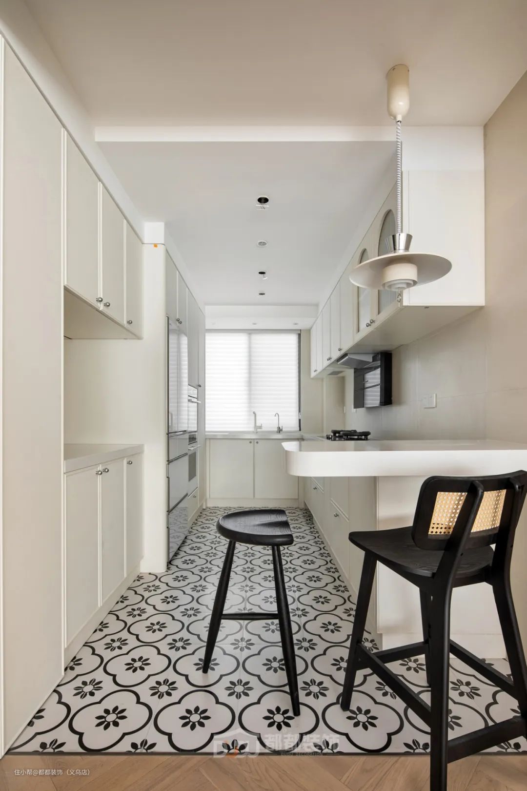开放式厨房的设计,巧妙的通过黑白花纹瓷砖与客厅作出区分,既保持了整体空间的连贯性,又赋予了厨房独特的个性。这种经典的黑白搭配,不仅时尚耐看,还让厨房区域显得更加干净整洁。 白色橱柜的设计,不仅美观大方,还大大增加了厨房的收纳空间。这些橱柜可以根据需求进行定制,内部可以设计各种实用的功能,比如抽屉、隔板、挂钩等,让厨房用品和食材都有各自的存放位置,拿取更加方便。 圆弧形的白色餐区,虽然小而温馨,但却能满足日常的用餐需求。简单的两人食出锅就能端上桌,这种设计充分考虑了小家庭或者单身贵族的使用场景。餐区的位置安排也考虑到了动线的合理流畅,无论是从厨房到餐区,还是从餐区到客厅,都能轻松自如地移动。