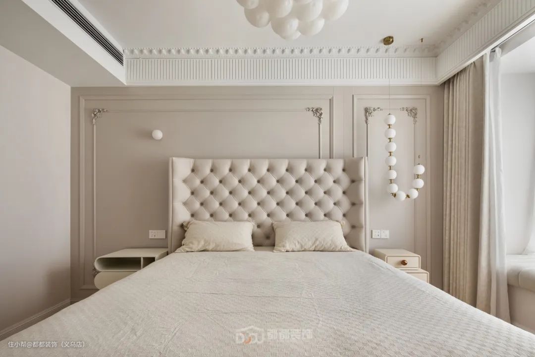 主卧的整体设计以暖色调为主,营造出一种温馨舒适的休息环境。软包床头和边缘圆角处理的床头柜,使整个卧室的线条更加柔和,给人一种温暖的感觉。 在卧室的设计中,大量的圆弧形处理减少了尖锐物品的存在,这在一定程度上保证了孩子的安全。例如,床头柜的圆角设计可以防止孩子意外碰撞,而软包床头则减少了孩子可能遇到的硬物伤害。 衣帽间两侧的白色通顶衣柜,不仅增加了收纳空间,还保持了卧室的整体风格。通顶的设计使得衣柜能够最大化地利用垂直空间,提供更多的储物空间。而白色的衣柜与卧室的暖色调相得益彰,使整个空间看起来更加整洁和宽敞。 靠窗的梳妆台,则为业主提供了一个可以独处的小空间。在这里,业主可以享受安静的时光,进行日常的护肤和化妆。梳妆台的设计可以考虑加入一些抽屉和隔板,以便于存放各种化妆品和饰品,让这个小空间保持整洁有序。
