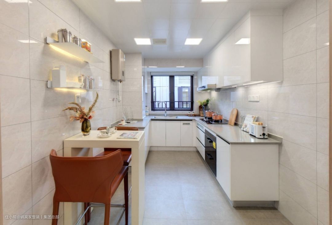橱柜采用白色门板搭配灰色石英石台面,整体感觉干净整洁。墙面贴满了同款瓷砖,易于清洁打理。水槽下方安装了净水器,方便饮用水。炉灶区域配有抽油烟机,方便烹饪时排除油烟。操作台上摆放着各种厨具和调料,方便做饭使用。吧台设计在厨房中央,可以作为早餐桌或者临时工作区使用。