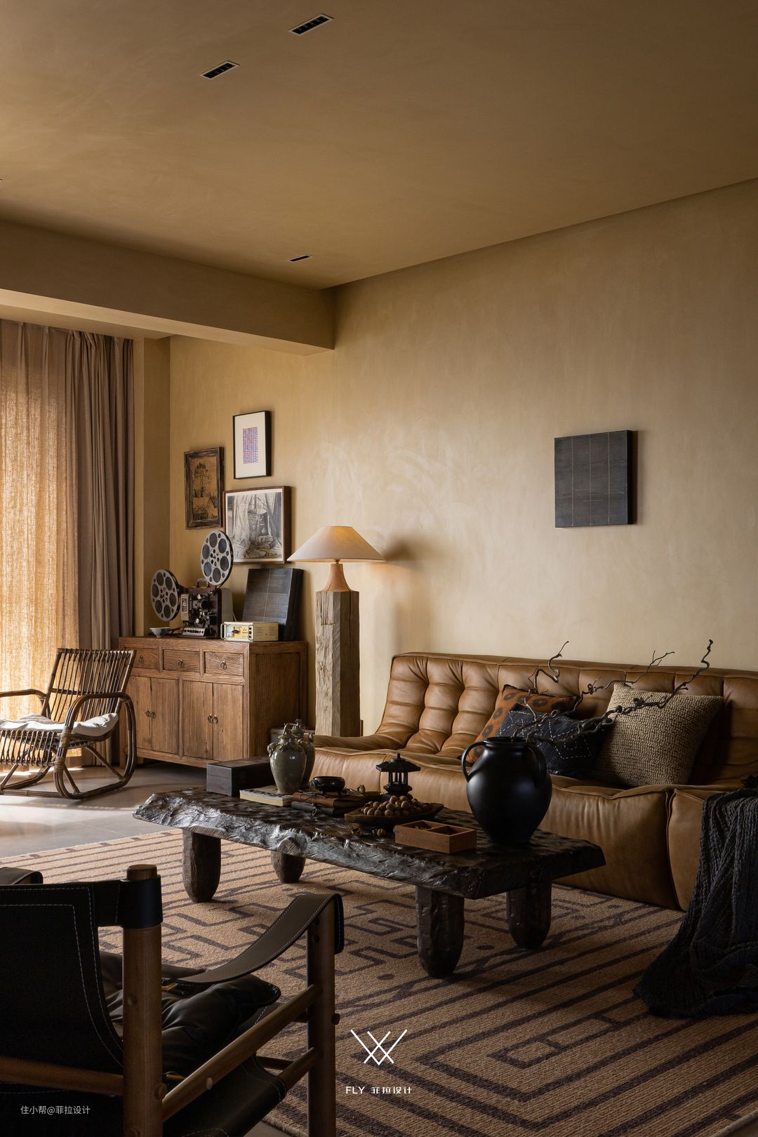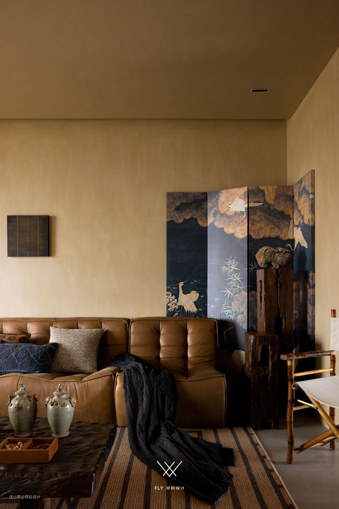 客厅着力于尺度与包容性的塑造,从而构建人与空间,人与物,物与物的和谐关系。层高与视野无遮的优势,赋予家充沛采光,大面夯土色的艺术涂料得以继续从容挥洒,地面适配以接近水泥地质感的灰色地砖,由玄关转入客厅,家居的主题风格延续不变,观感连贯不曾中断。 #客厅 #艺术涂料 #地砖 干净的平顶在嵌入式无主灯光源的加持下,进一步拉伸层高,扩大舒展空间,化解生活区的拘谨感,令人物的互动更为轻松舒畅。 #无主灯 #吊顶 #艺术漆 #客厅 软装作为“生活方式”的外在体现,通过色彩搭配、审美和实用需求的调和,赋予空间张弛有度的节奏感。大地色系的棕色、褐色依附皮质、木质与布艺等材质,对客厅加以修饰,局部穿插深沉的黑色,更添一份沉稳与神秘,引发居者对自然的贴近与依恋。 #客厅 #软装 #大地色系 细腻柔然、纹理自然的苯胺皮沙发演绎着复古腔调,比沙发稍浅两度的咖色羊毛沙发,敛去地砖的冷硬,为空间注入柔和感触,进一步彰显客厅层次。沙发背景墙删繁就简,一幅简单的复古小画,加以氛围灯带的装点,便足够撩人心弦。 #客厅 #沙发 #地毯 立于沙发后的丹仙鹤祥云屏风,汲取中式美学与隔断设计精髓为一体,填补客厅过分的空白,高饱和度的靛蓝底色,蕴含着高贵冷艳气质的同时,也成功激发出空间的活力感。 #客厅 #屏风 #茶几 与家人的云南之旅中,偶然发现的木联,让屋主如获至宝,如今它也被妥善安置于客厅角落处,与中古屏风产生和谐的化学反应,时时提醒着屋主在旅途中的那份心境与感受。 #屏风 #木联 #装饰品 寻于山野的奇石,在大自然鬼斧神工的雕琢之下,形似一只犀牛,一只蜜蜂,也像极了一只狗,为客厅增加了诸多野趣。 #立柱 #屏风 #客厅 由做旧的木头,刀刻斧凿而成的茶几,视觉张力爆棚,每一道凿痕,都藏着一段不为人知的故事,至此,器物本身,跳脱出单一置物功能的设定,也是惊艳空间的艺术装置。 #茶几 #客厅 #木质 沙发另一侧的立柱,也是屋主在云南之旅中收获的藏品,与亚麻灯罩创意性结合,组成一盏世间独一无二的落地灯,为客厅增色良多。 #沙发 #落地灯 #客厅 夜幕四合,落地灯被点亮,犹如一颗黑夜中冉冉升起的启明星,灯光惠及的场域,围合成舒适温馨的一角,足以慰藉身心,安放灵魂。 #客厅 #落地灯 #灯光 简约的电视背景墙,贯穿客厅与阳台两个空间,横向延展着视线,视觉开阔大气。地台柜与黑色悬空柜以半包围的形式,勾勒出造型的立体感,又兼顾了客厅的储物需要。 #客厅 #电视背景墙 #悬空柜 原定的地台电视柜,本该由老屋拆换下的青砖砌就,最后因全部砖块破旧不够完整而只得放弃,改以贴砖的形式呈现,稍显遗憾。竹楼、蝈蝈笼和暖水壶摆件,皆取材自屋主对老家生活的记叙,仿佛那些无忧无虑的孩童时光,从未远离。 #客厅 #地台柜 #木桩 #摆件 悬空柜底部,均匀码放着一排木桩,宛如屋主记忆里家乡的柴火垛,对乡土的眷念,贯穿整屋设计始终。 #客厅 #悬空柜 #木桩 层高的优势,令客厅享有俯瞰整个城市的开阔视野,全景式落地窗,毫不吝啬的将窗外之景邀约入内,精心布置的艺术茶几与靠背椅,构建惬意的休闲角落,邀友相会、品茗闲谈,不失为人生一大乐事。 #落地窗 #茶几 #客厅