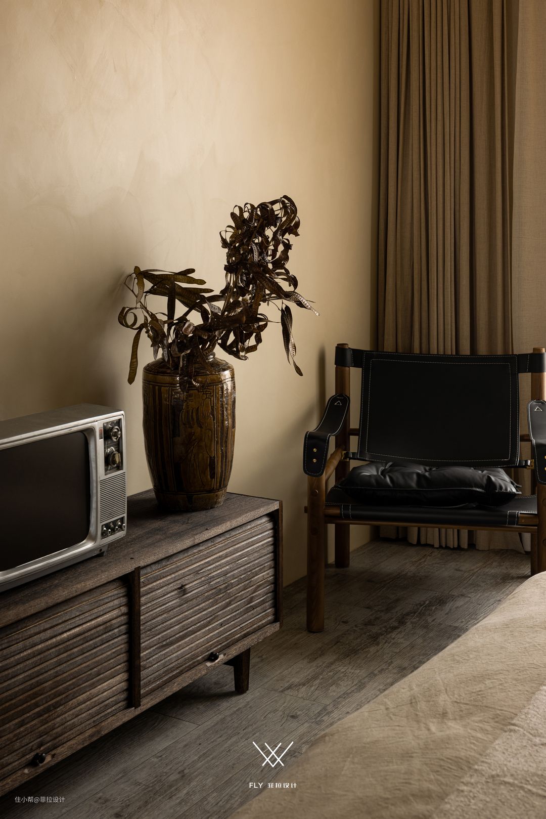 米灰色纱帘揉碎阳光,洒落在斑驳的木地板上显现出独有的纹理,柔和且宁静。充满古拙气息的木质窗帘盒,与整屋的调性不谋而合,也暗含屋主对往昔乡村生活的追溯。 #主卧 #窗帘 #窗帘盒 透着年代感的木质斗柜,完成了床尾收纳与展示美感的统一。台面上老式的电视机,开机后满屏雪花点和耳畔传来的沙沙声,将思绪带回到那个没有电子产品的纯真年代,与小伙伴,三五成群下河游泳、抓泥鳅,累了就躺在竹椅上吹凉风……物质生活也许不甚富裕,但精神层面,屋主却倍感富足。 #主卧 #斗柜 #电视 90年代以前农村常见的扶梯,摇身一变,成为主卧的挂衣架,作为度假的居所而言,软装陈设大可不必追求现代与时髦,反而是老旧的物件,更能营造屋主希冀的松弛感。 #主卧 #木梯 #斗柜