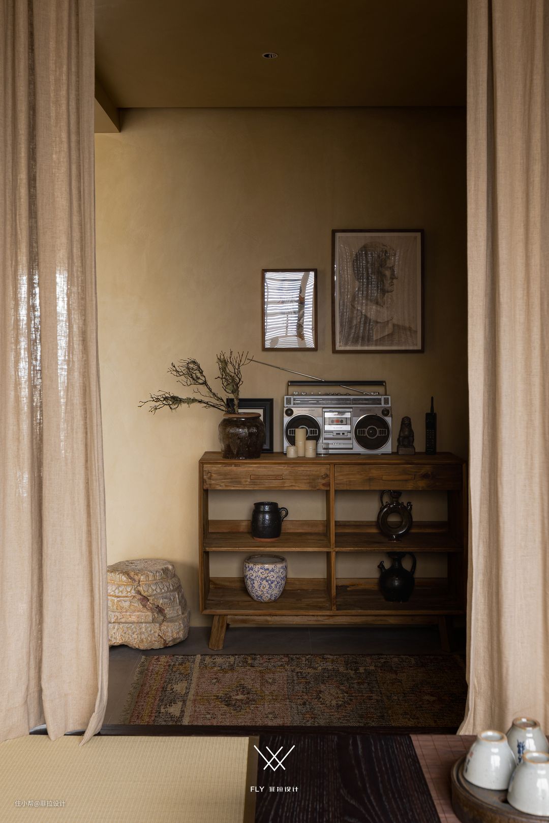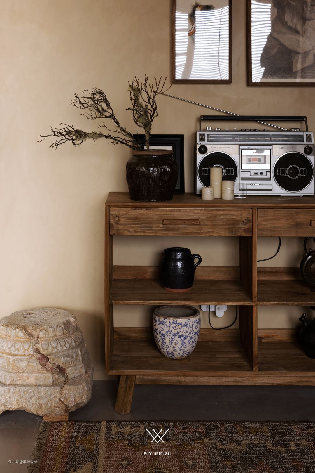 做旧的斗柜弥补了玄关过分的空旷感,内置的粗陶花瓶、摆件,也隐约可窥老家乡村的印记。台面上老式收音机,是特定年代的结婚必备物品,也是时代生活变迁的重要见证。玄关宛如微缩的旧物博物馆,存储着过往的老物件与屋主对儿时生活的追忆。 #玄关 #斗柜 #石墩 默立于斗柜旁的石墩,是独具一格的装饰,亦可作为换鞋凳使用。屋主在少年时期,便将其收集珍藏并保留至今,现下新家又赋予了其新的使命,在接触到石墩的某一刻,过往的点滴总会不断在眼前浮现,触及心灵,牵引思绪。 #石墩 #玄关 #边柜