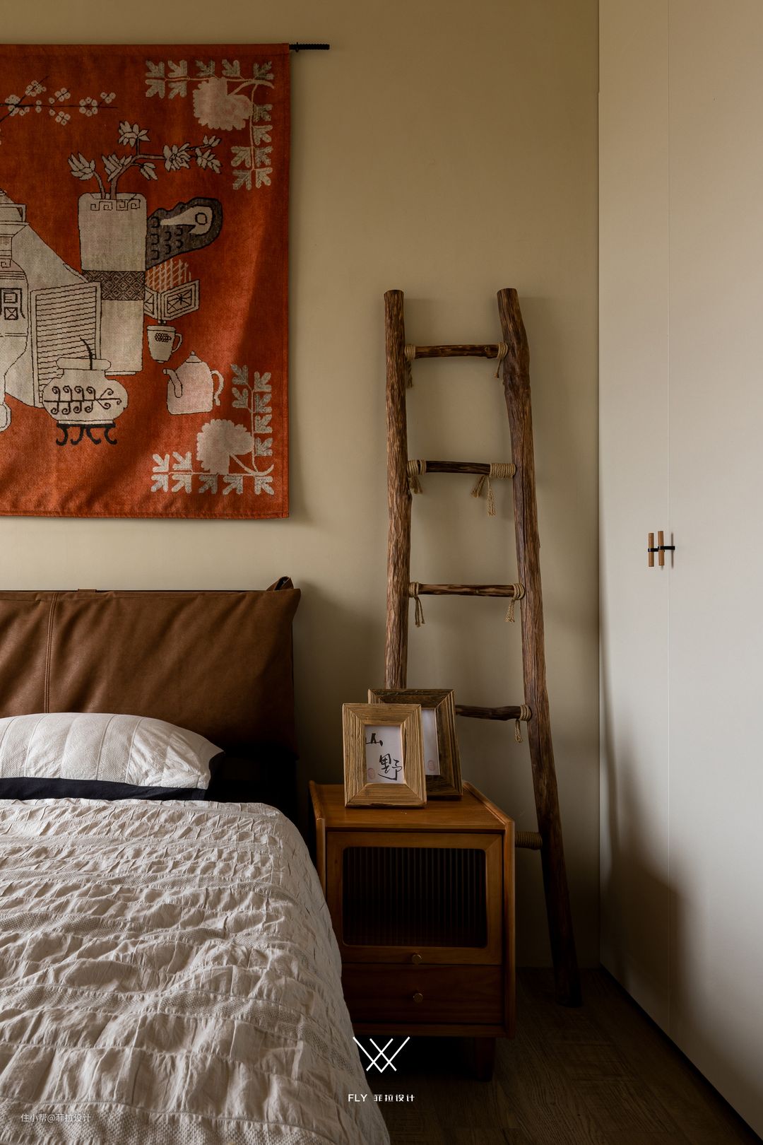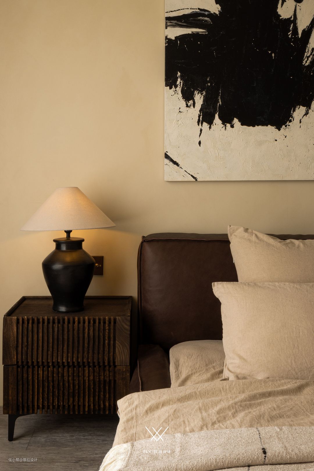 肌理感艺术漆与木纹地板的搭配,延续到就寝区,主卧私密有序。放弃吊顶的设计,明装筒灯保留空间呼吸韵律与视觉设计感。伴随飘窗的纳入,主卧收获更广阔的采光面,光影交织,尽显静谧自在。 #主卧 #艺术漆 #无主灯 借由墙体拆改,主卧新增衣帽间功能,进阶功能配置更为齐全的套房之余,一并转移就寝区的收纳压力,打造沉浸私密的睡眠场域,在都市打拼,略显奢侈的安然入梦,却是老宅度假的生活日常。 #主卧 #衣帽间 #套房 #主卫 木质的温度与自然的触感,依然是主卧不变的主题,深邃的棕色落地床与床头柜,理所当然的凝聚空间的视觉焦点,以柔软俯身的姿态,承载着屋主日常的起居,让身心与天然纯粹的材质更为贴近,从而汲取力量与心灵的滋养。 #落地床 #主卧 #床头柜 床头背景不饰他物,唯有抽象黑白涂鸦画点缀其间,将东方美学的留白与平衡,拿捏得恰到好处,衍生出空间的无尽想象力。粗陶花瓶台灯,质感粗粝,与艺术漆包裹的纯粹主卧相得益彰,营造出简洁的朴素感。 #床头背景墙 #装饰画 #台灯 空间是建筑的实质,而光则是其灵魂,微黄的暖光从床头向四周晕染开来,沉寂的空间便有了家居的温度与灵魂。 #灯光 #床头灯 #斗柜