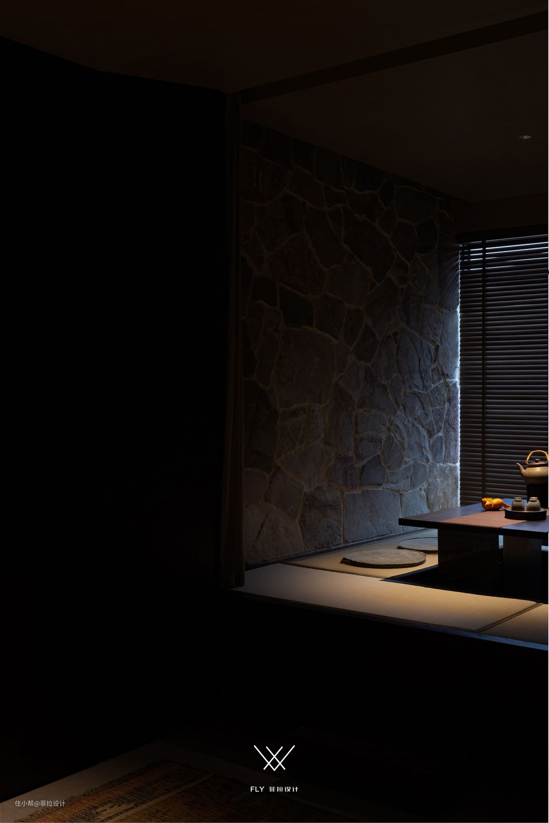 人生是旷野而非轨道,无论是按部就班的生活还是空间布局,终归失之无趣,人也离不开精神角落的滋养,将进门的次卧改为清雅榻榻米茶室,在喧嚣的尘世,给自己留一处“世外桃源”,可以独处关照内心,也能与三五好友,小聚清谈,乐而忘忧。 #茶室 #榻榻米 #茶桌 传承东方美学,茶室以修身、静心为立意,舍弃矫揉繁复的装饰,以古拙自然的材质与温润肌理,营造古朴雅幽之境,气质出尘,见而忘俗。 #茶室 #石材 #榻榻米 茶室内的石壁墙,从老家的山上就地取材铺贴,天然石材独有的粗犷和纹理的生动感,让空间与屋主记忆中的家乡,产生更紧密的链接,来自大自然平和与治愈力,也悄然抚慰着快节奏都市精人内心的浮躁。 #石材 #茶室 #榻榻米 茶室采用局部照明与间接照明结合的方式,产生明暗、虚实的变化,适应多场景的氛围感营造的需要,有力增强了空间的视觉表现力。 #茶室 #木百叶 #石材