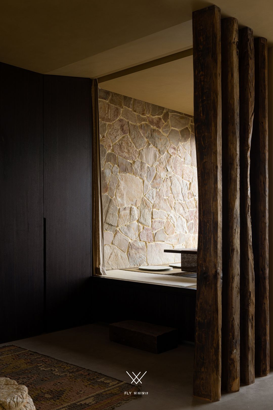 一袭软帘,让茶室与玄关似隔非隔,历经岁月洗礼的石壁与木柱屏风,隔空对望,仿佛上演了一场时空穿梭之旅,关于过往的记忆,如潮水般涌来。 #玄关 #茶室 #石材