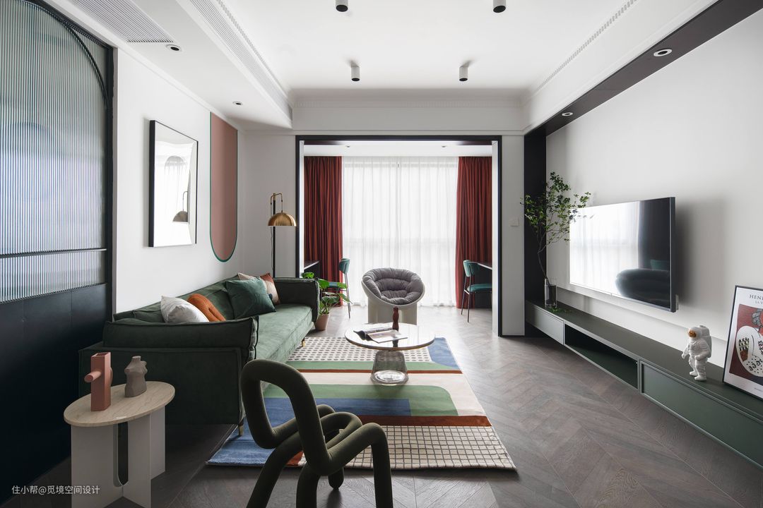 客厅没有复杂的吊顶和繁琐的装饰,简单的双眼皮吊顶增加空间层次感。沙发区无主灯设计,打造温馨与自由。低饱和度的橄榄绿与胭脂红,治愈、复古,空间柔美和谐,满足颜控对家的幻想