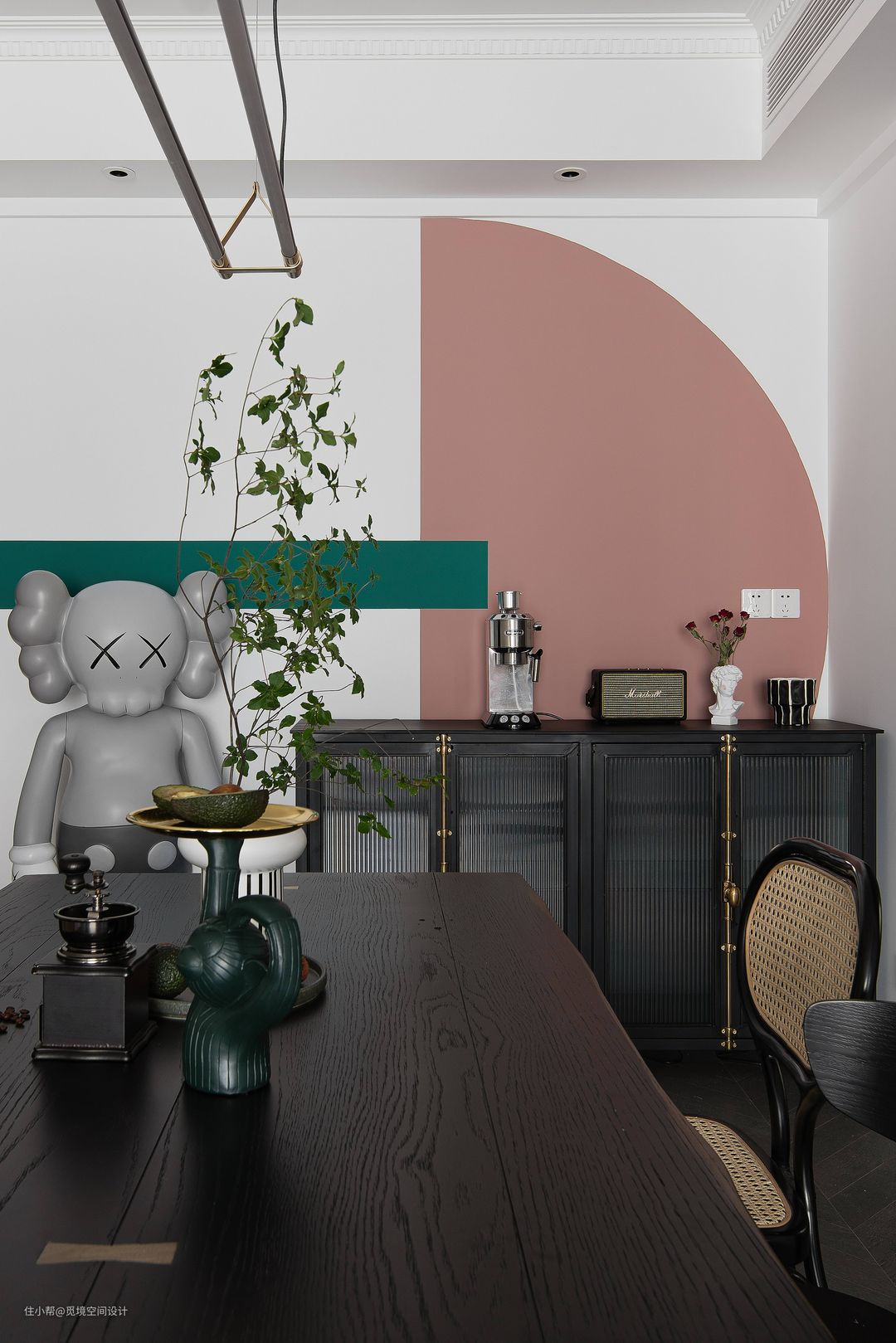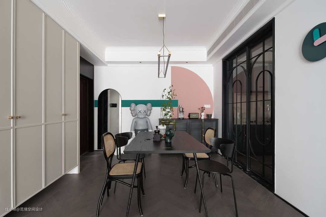 整体以深色木纹砖+绿和粉色点缀,自然和谐的中古家具调搭配简约的设计,演绎出治愈浪漫的现代复古感,既有烟火气也散发着温柔又高级的魅力
