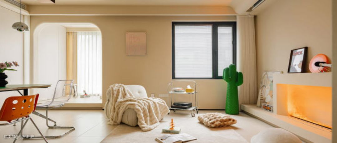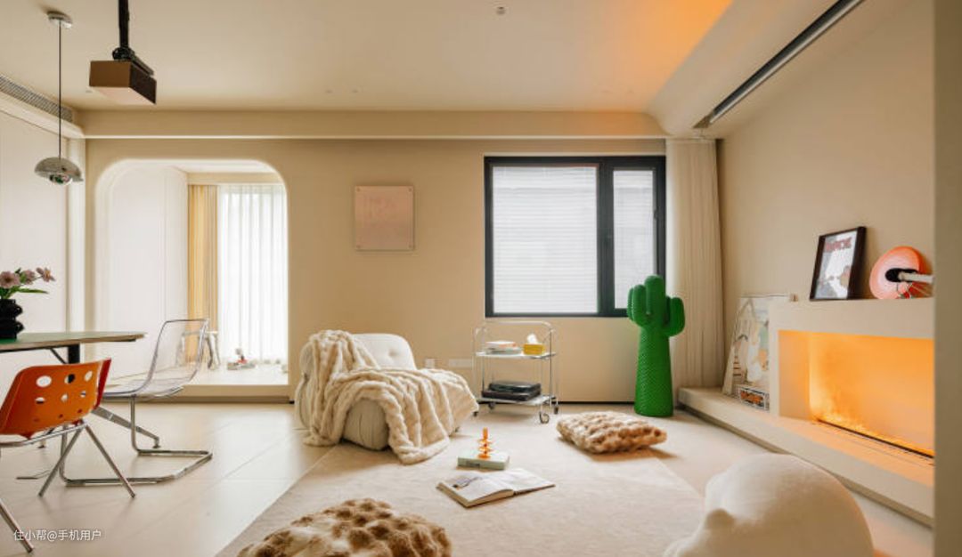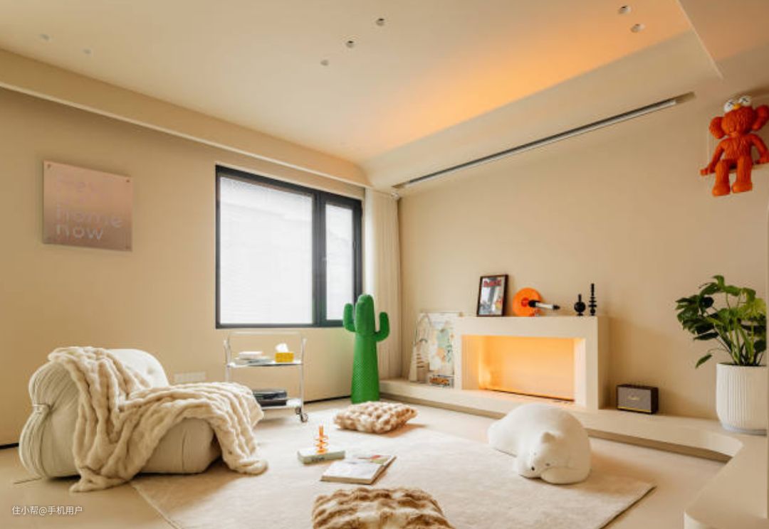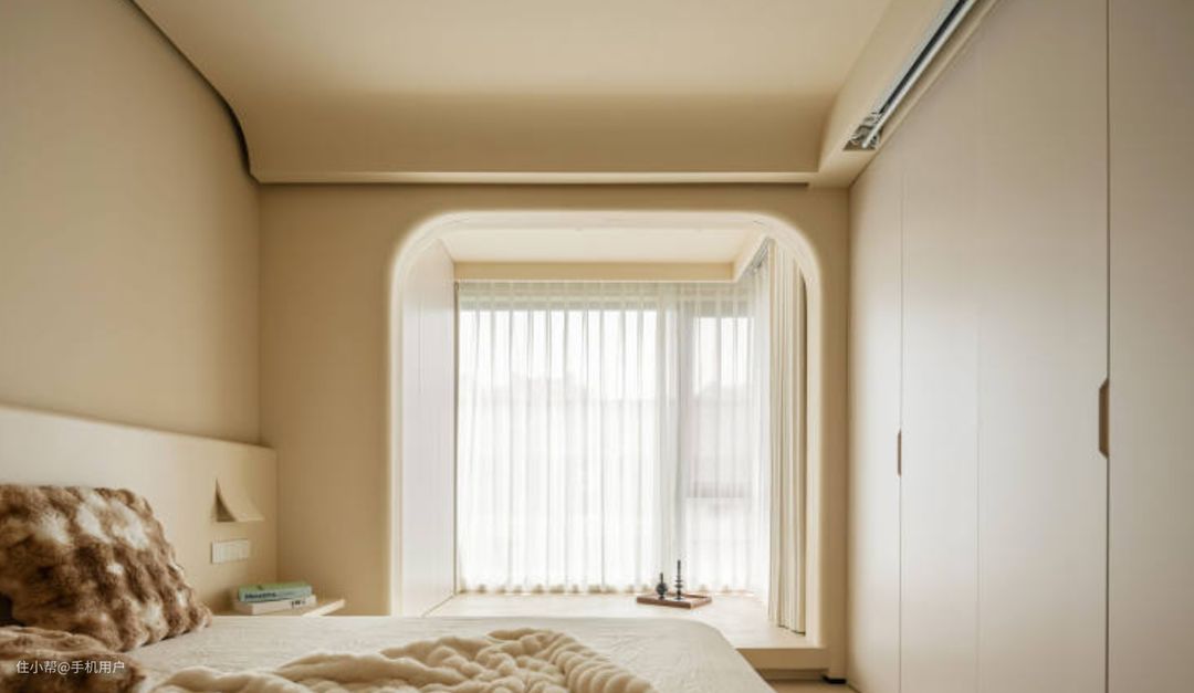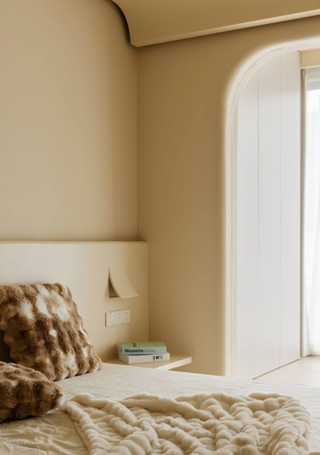 主卧长这样,依然是整体用的暖调的奶油色艺术漆,卧室自带一个小阳台,所以肯 定直接跟内部打通,但是把整个阳台用地台抬高了一点,做成一个休闲区,侧边靠 墙还用来定做了柜子增加储物量,不仅实用还好看。