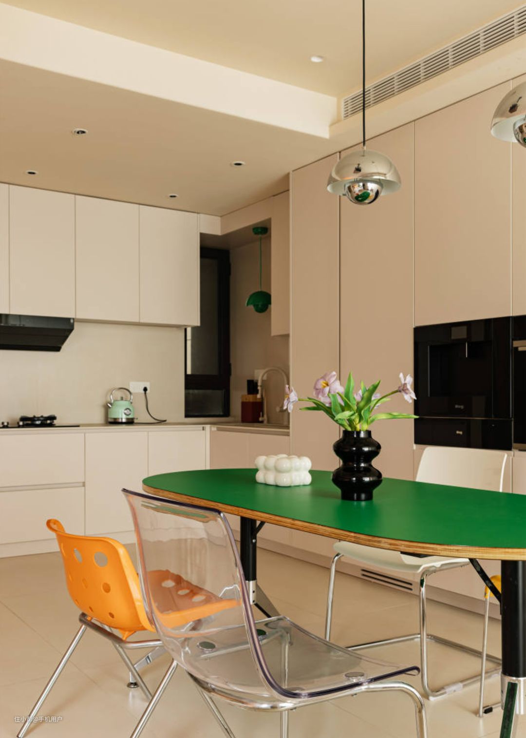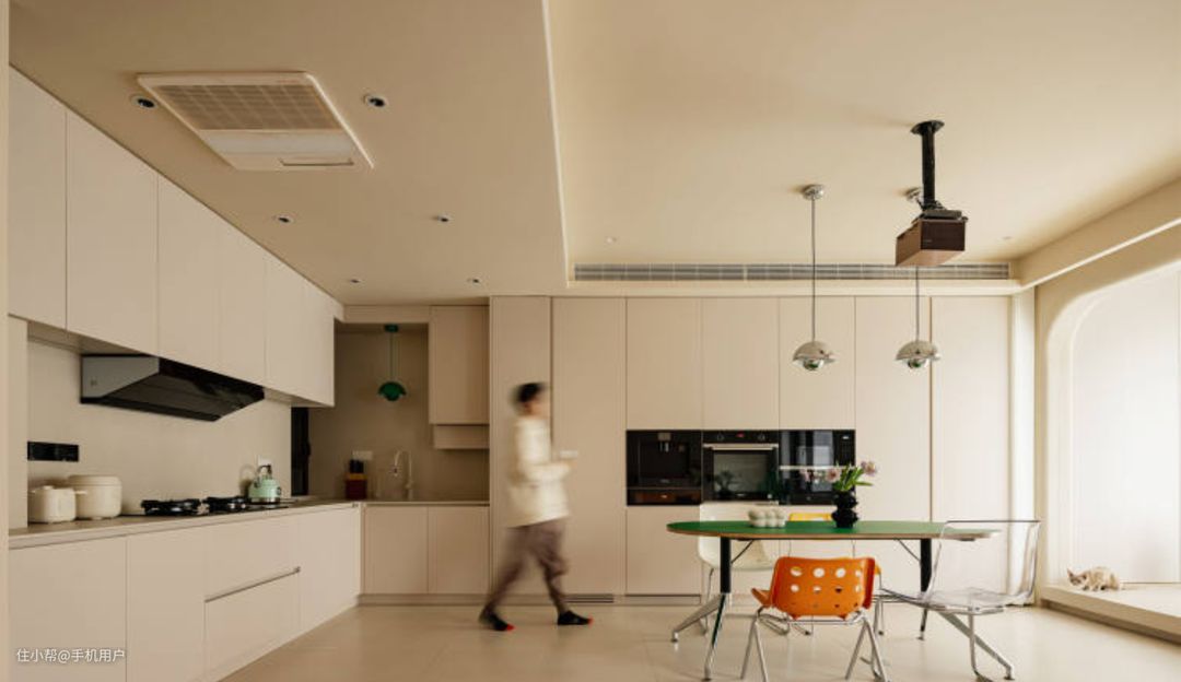 客厅看餐厨的视角就是这样子的了,客餐厅之间没有任何的阻碍,厨房的墙拆掉之 后,跟餐厅之间也直接融合一体,所以显大的感觉直接拉满,我们家单层其实不到 80平,但朋友来都说感觉不止。