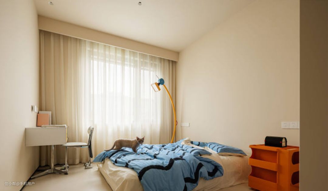 次卧室备用卧室依然走的简约纯色风格,放了一张落地床,外加一张书桌和床头 柜,靠内没有拍到的这一侧有定做衣柜,基础功能是都齐全的,只不过现在还没人 住,就是朋友或者爸妈偶尔过来住一下。