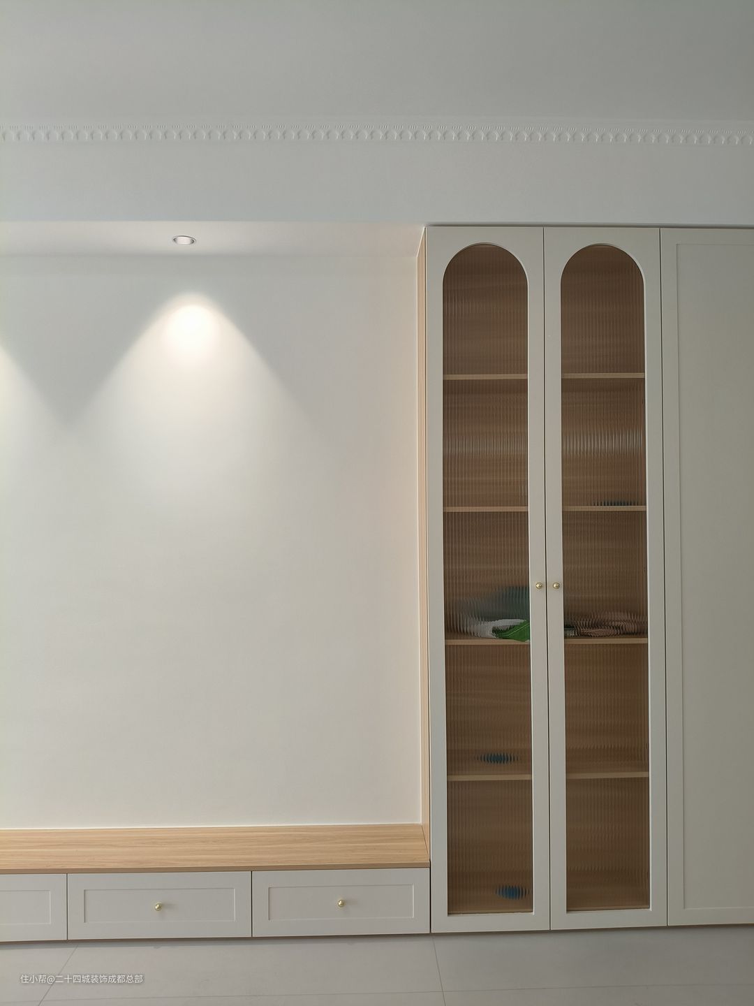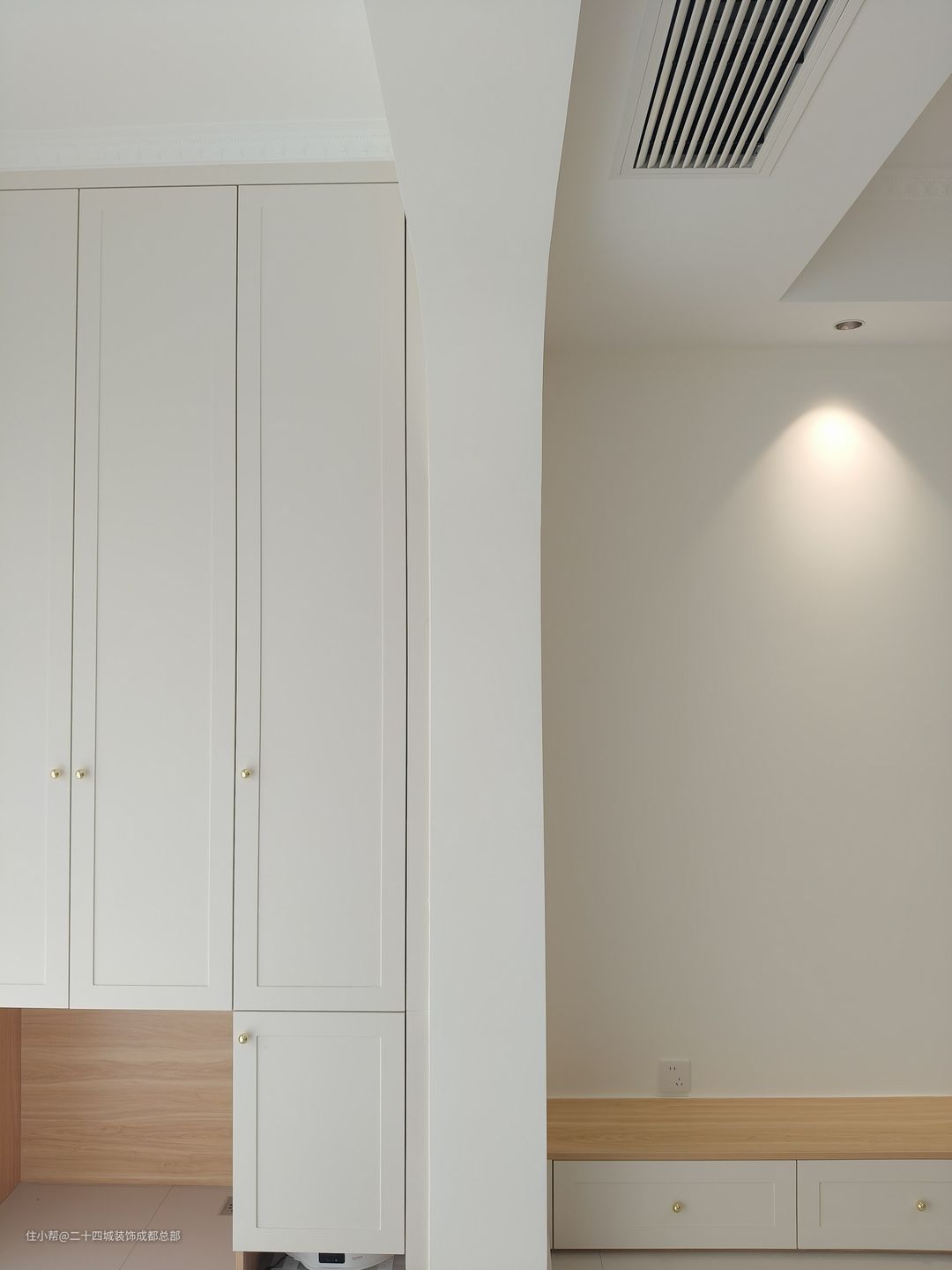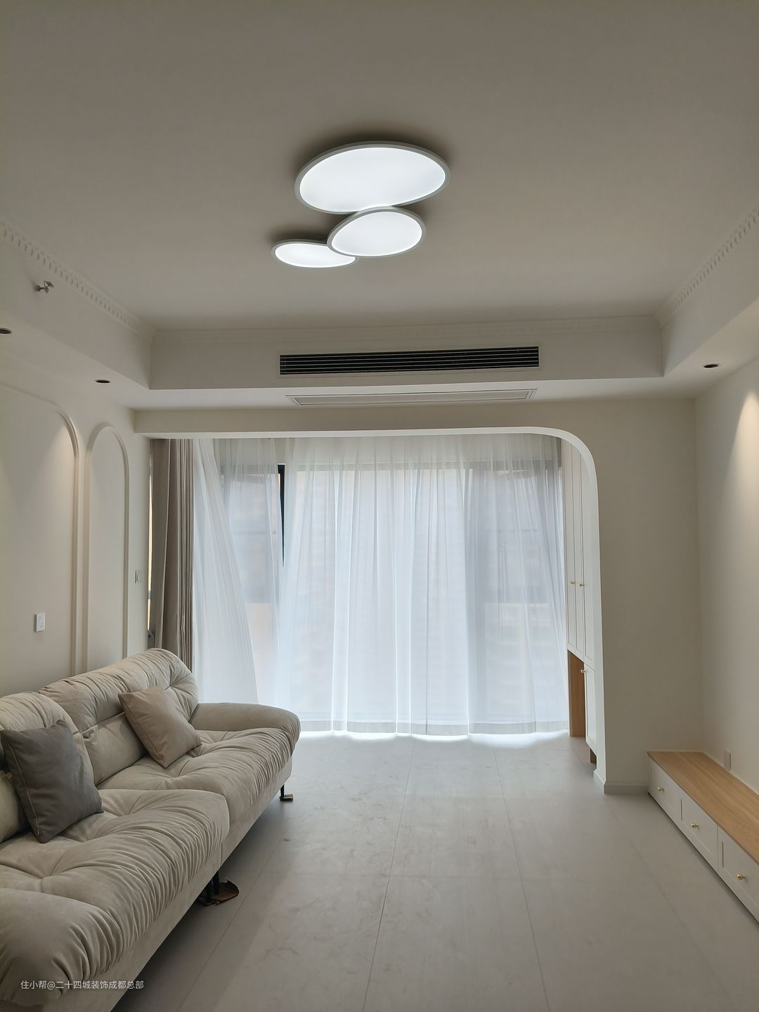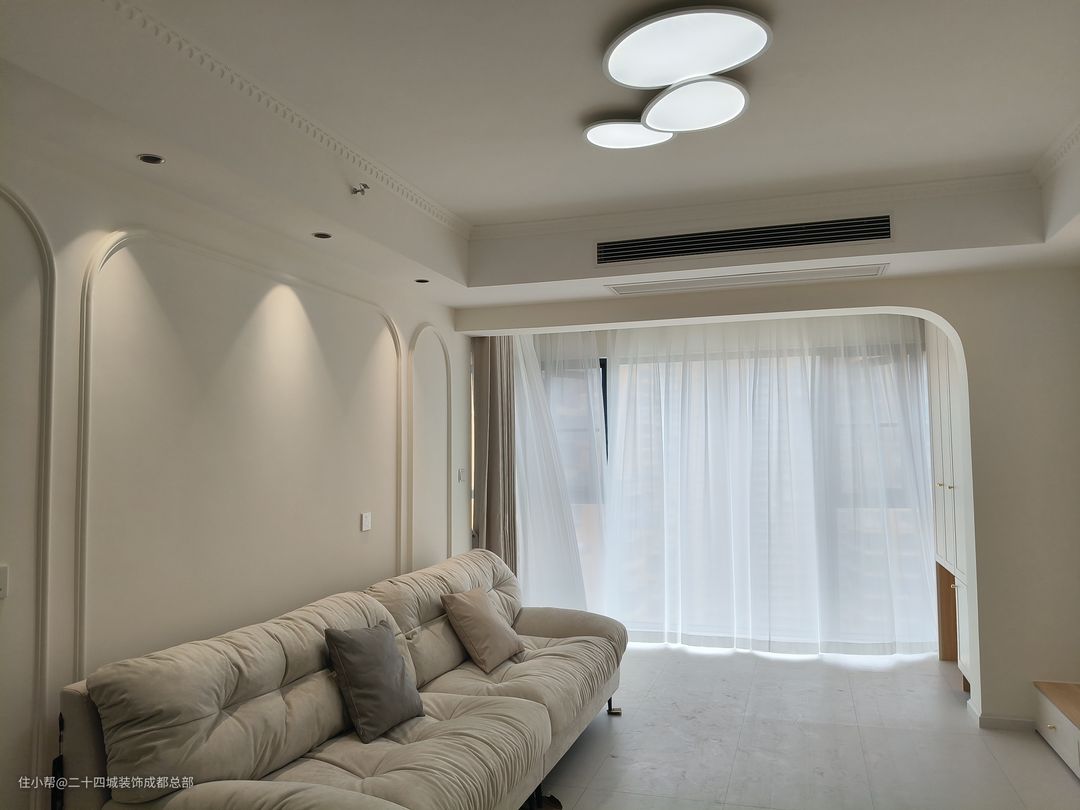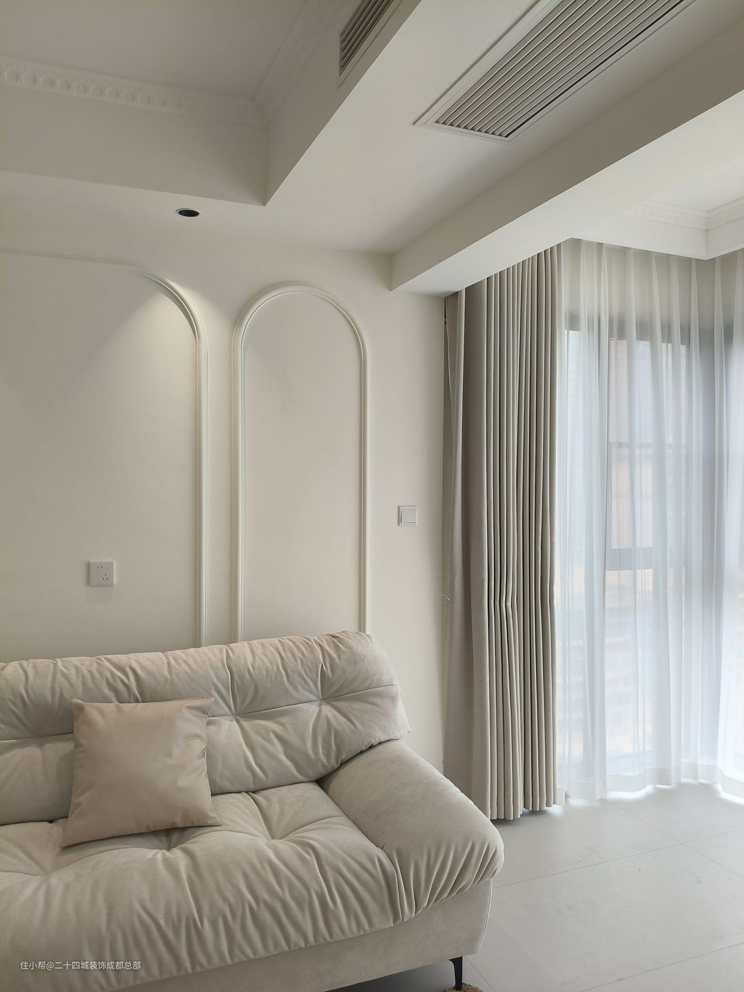 面积:103平米 风格:现代法式+奶油风混搭 简洁朴素的空间基础,融入法式的浪漫与优雅,打造出一个别具一格的空间。 运用法式的造型线条,弧形门洞、石膏线条进行装饰,为空间增添浪漫气息。同时,采用温馨的小山丘射灯,打造舒适新家