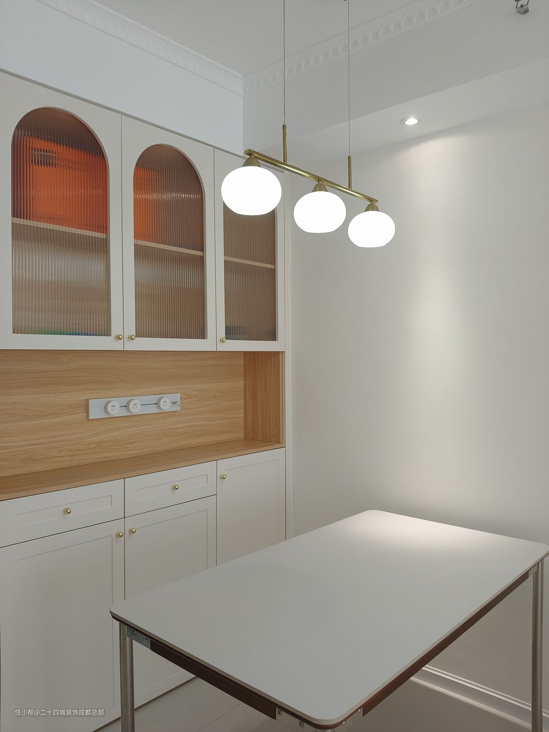 玄关步入室内,眼前一片新景象。小餐厅精致布置,巧妙的空间布局令人眼前一亮。 餐边柜采用奶油白和原木色系,质感十足,同时上方采用纹理玻璃,增添了一丝轻盈与通透。 圆形吊灯的餐厅灯具,不仅为用餐者提供了舒适的照明,更营造出一种温馨的用餐氛围。