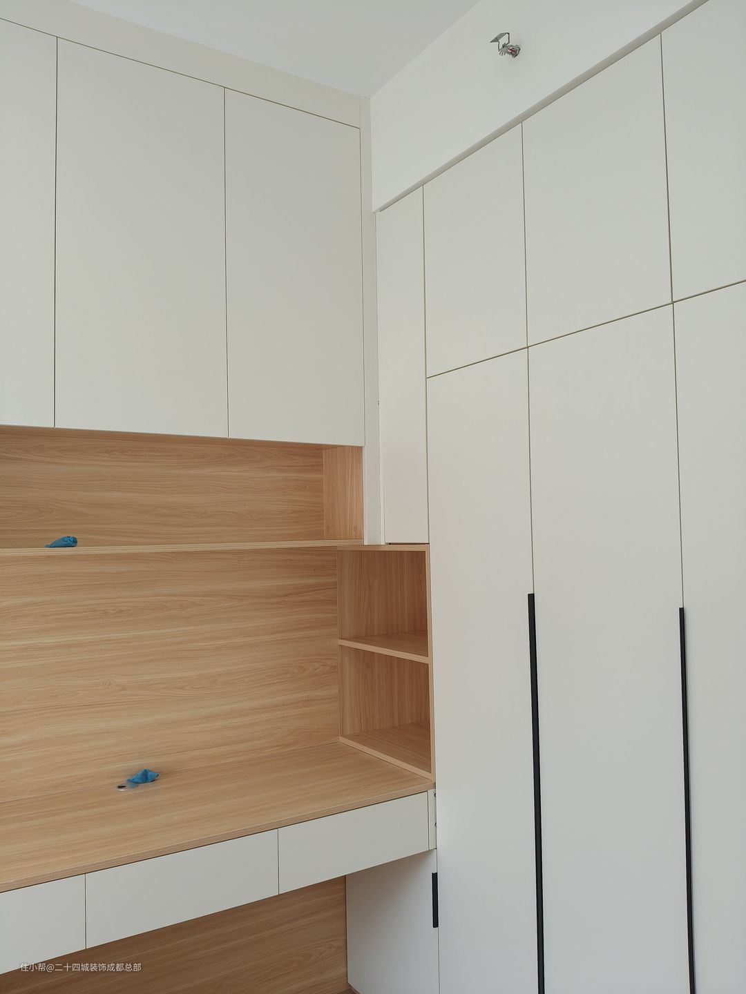 采用了L型一体化定制方案,将衣柜与书桌紧密相连,形成一个整体。这种设计不仅充分利用了有限的空间,还为女儿提供了充足的学习空间。书桌设计简洁大方,桌面光滑易清洁,女儿可以随时随地安心学习。