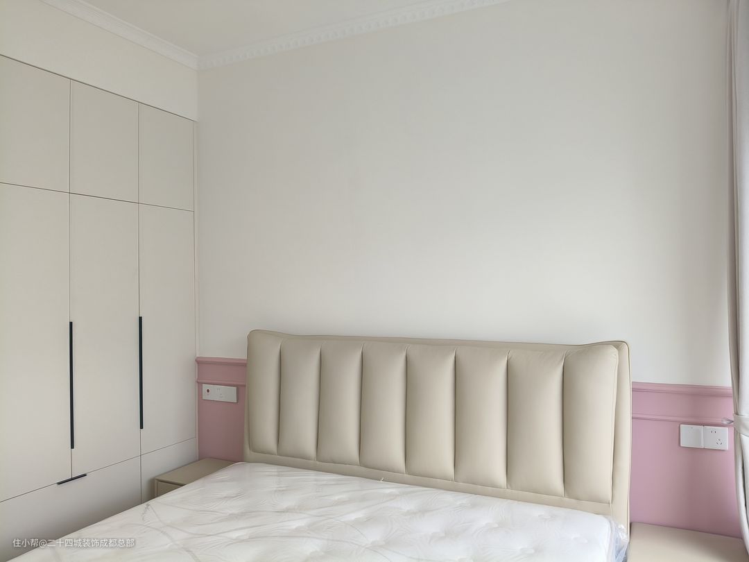步入这个空间,仿佛被一股轻浅宜人的氛围所包裹,让人感受到一种宁静与舒适。整个卧室的设计继续延续了温柔的奶油风格,奶油白色和淡粉色的搭配,营造出一种温馨而浪漫的氛围。 在床边,我们设计了一门到顶的大衣柜,其收纳能力足以媲美专业的衣帽间。为了确保衣柜的耐用性和美观性,我们对柜门的上下部分进行了分段设计,有效延长衣柜的使用寿命。