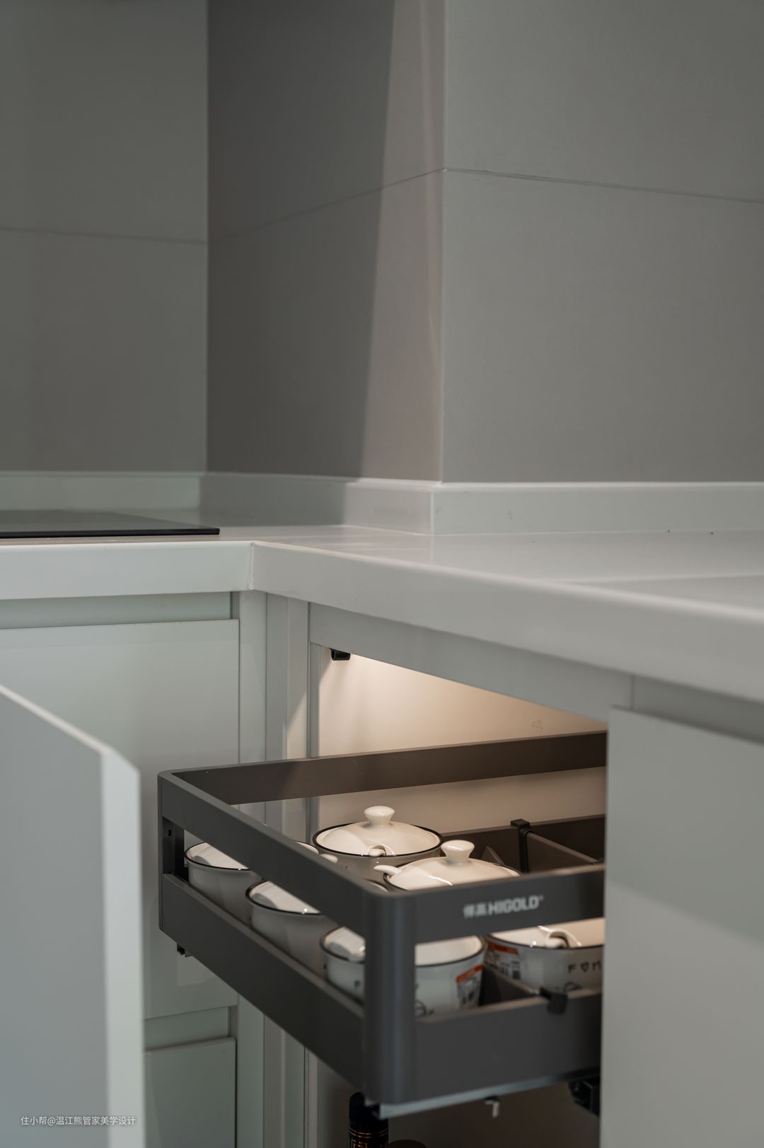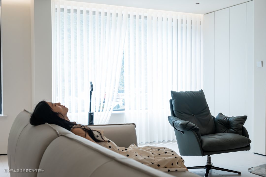 厨房位于客厅沙发的后方,隐形口袋门的设计让整体更加实用美观,需要隔绝油烟的时候关起来,不需要的时候打开,使厨房、客厅、餐厅完全连成一个整体,空间还是开放流通的; 口袋门两侧做了隐形储物柜,和墙面融为一体,美观又实用; 针对日常的烹饪习惯,中式厨房是一个不可或缺的空间,L型布局充分利用了空间,纯白色柜门延续客餐厅主色调,营造清爽的视觉感受; 厨房尽头零嵌冰箱,考虑到平时还有储存牛羊肉的需求,又多增加了一个冷冻冰箱的空间;升降式抽油烟机和小料台,让空间更显轻松治愈。