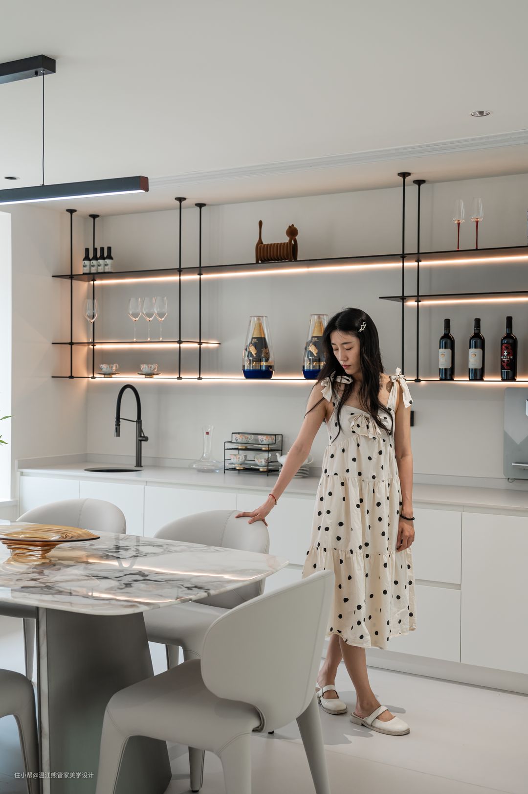 改造后的餐厅设计了独立的餐桌和西式厨房区域,赋予了空间更多可能性的同时,还可以增强家人之间的互动关系,展现出和乐融融的家庭氛围; 餐边柜摒弃了常规封闭式设计,改为岩板桌面+铝板的开放式置物架,内嵌灯带,拿取自如,氛围感十足; 餐厅另一侧改造为通往二楼的楼梯,楼梯下方的闲置空间作为手办展示区,刻意的没有做成置物柜也是为了保证空间的通透感; 餐厅以悬浮楼梯为背景,灵动、立体、雕塑感满满的悬浮设计也成了空间的焦点。悬浮踏步+玻璃扶手的设计让整个楼梯体量变得轻盈,而微水泥和玻璃的硬朗则增加了空间的质感和分量感。