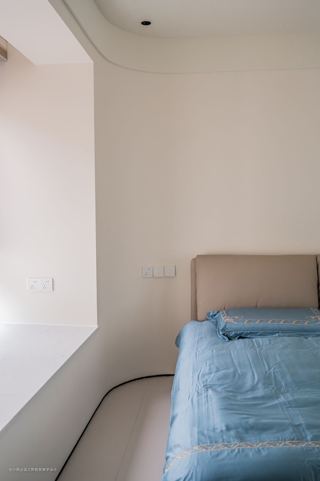 一楼和二楼都设定有卧室,一楼卧室隐藏在电视背景墙的后方,隐形门的设计与墙面色调一致,推开后又别有洞天; 二楼设立儿童房和书房,书房延续餐厅餐边柜的设计,开放式书架做了更多开放格用来放置图书摆件,简洁的线条勾勒出层次感; 卧室床头圆弧形设计,赋予家居更多灵气;两边床头上方都增加射灯,半夜起夜也不会因为灯光太亮晃眼睛; 床头对面设立小型衣帽间,衣柜u型设计,提供空间利用率。