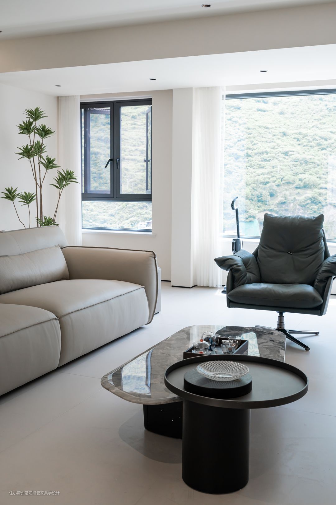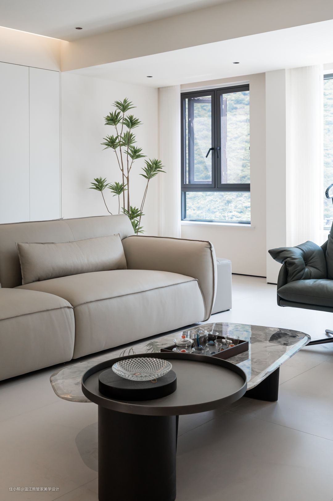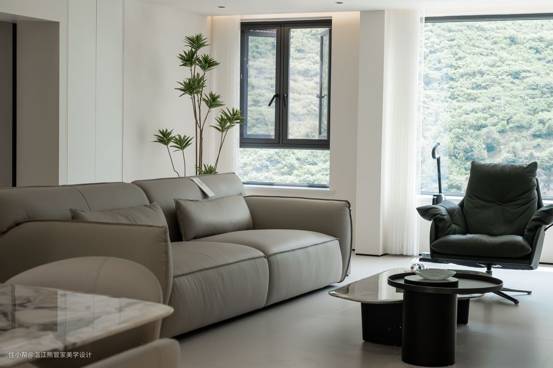 进门右手边为客厅区域,悬浮吊顶+无主灯设计,素雅而简洁的色彩作为空间的主要色调,通铺白色柔光砖,营造出低调、简洁、洒脱的气质; 沙发颜色一深一浅,深浅渐变搭配的恰到好处,配上同色系不规则小圆茶几,减少了空间的沉闷之感。后方角落放置绿植,背靠厨房,独特的柜门设计充当沙发背景墙,给空间带来了一份优雅与精致; 电视背景墙以简约的形式呈现,悬浮吊顶中内嵌灯带,灯光柔和洒下,又不影响观看体验,但增加了空间的层次感,使整个客厅空间更加开阔和整洁。
