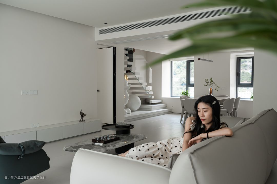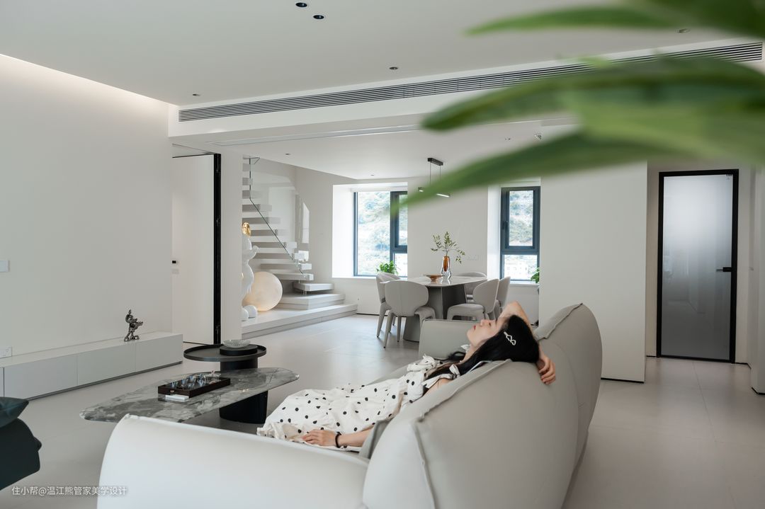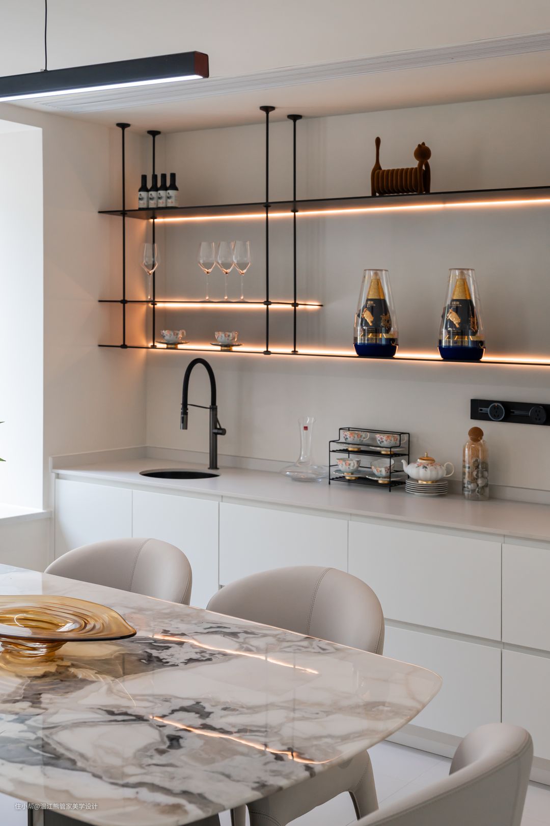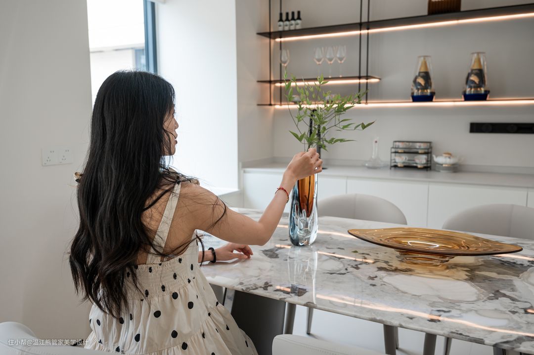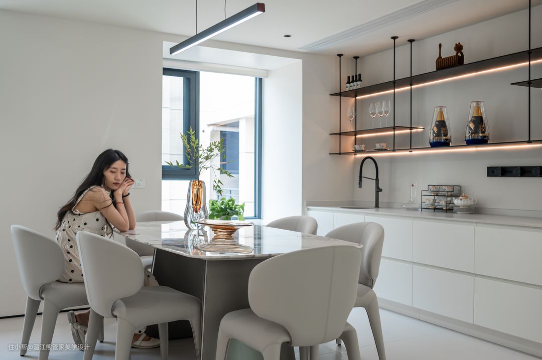 改造后的餐厅设计了独立的餐桌和西式厨房区域,赋予了空间更多可能性的同时,还可以增强家人之间的互动关系,展现出和乐融融的家庭氛围; 餐边柜摒弃了常规封闭式设计,改为岩板桌面+铝板的开放式置物架,内嵌灯带,拿取自如,氛围感十足; 餐厅另一侧改造为通往二楼的楼梯,楼梯下方的闲置空间作为手办展示区,刻意的没有做成置物柜也是为了保证空间的通透感; 餐厅以悬浮楼梯为背景,灵动、立体、雕塑感满满的悬浮设计也成了空间的焦点。悬浮踏步+玻璃扶手的设计让整个楼梯体量变得轻盈,而微水泥和玻璃的硬朗则增加了空间的质感和分量感。