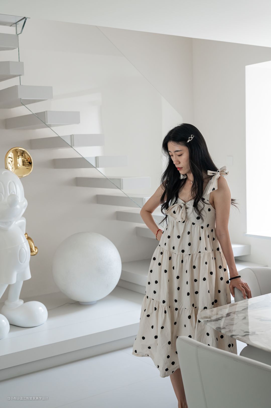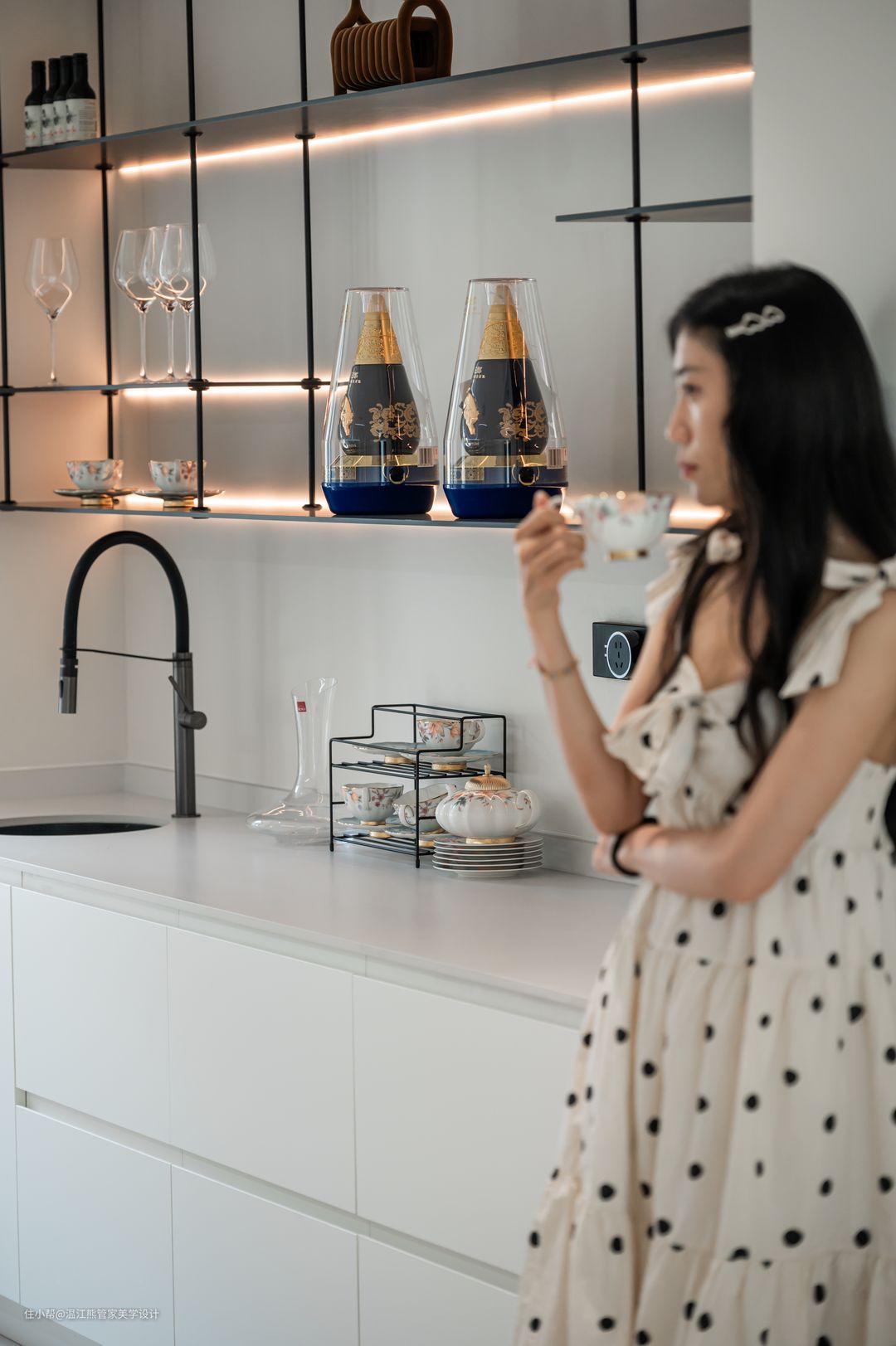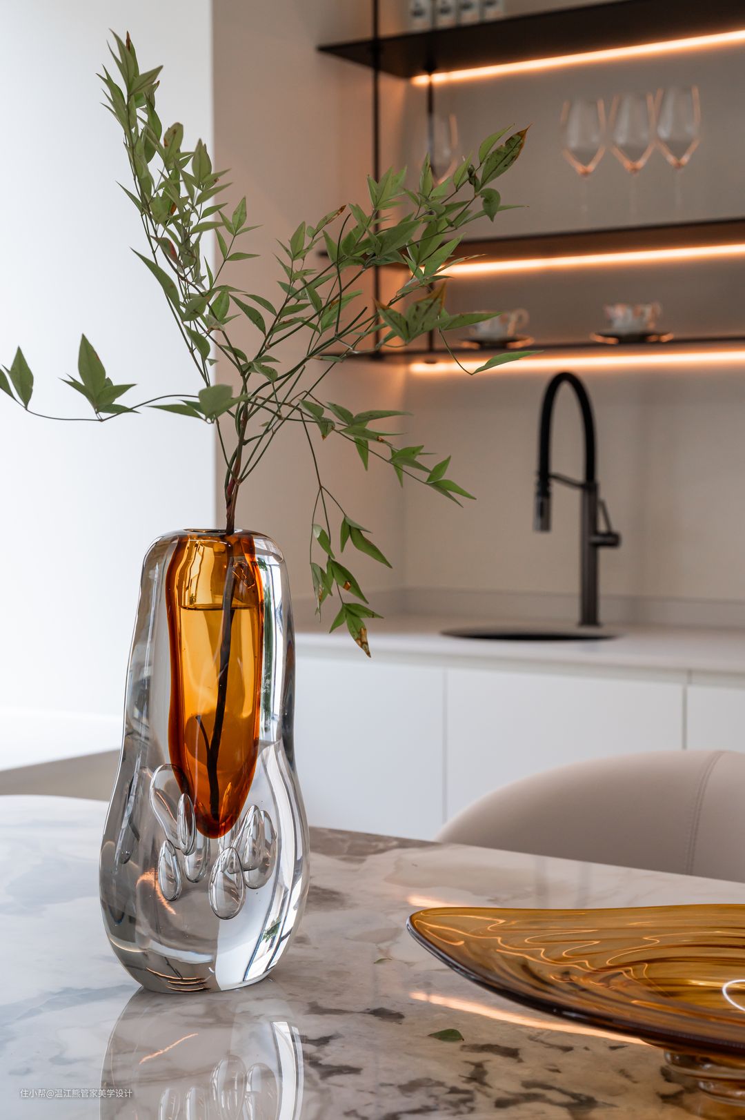 改造后的餐厅设计了独立的餐桌和西式厨房区域,赋予了空间更多可能性的同时,还可以增强家人之间的互动关系,展现出和乐融融的家庭氛围; 餐边柜摒弃了常规封闭式设计,改为岩板桌面+铝板的开放式置物架,内嵌灯带,拿取自如,氛围感十足; 餐厅另一侧改造为通往二楼的楼梯,楼梯下方的闲置空间作为手办展示区,刻意的没有做成置物柜也是为了保证空间的通透感; 餐厅以悬浮楼梯为背景,灵动、立体、雕塑感满满的悬浮设计也成了空间的焦点。悬浮踏步+玻璃扶手的设计让整个楼梯体量变得轻盈,而微水泥和玻璃的硬朗则增加了空间的质感和分量感。