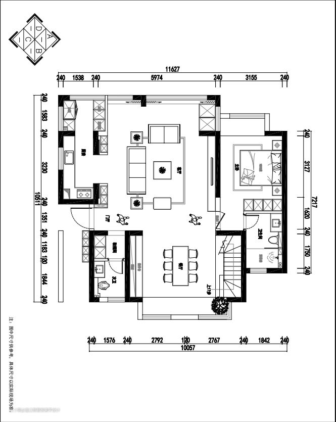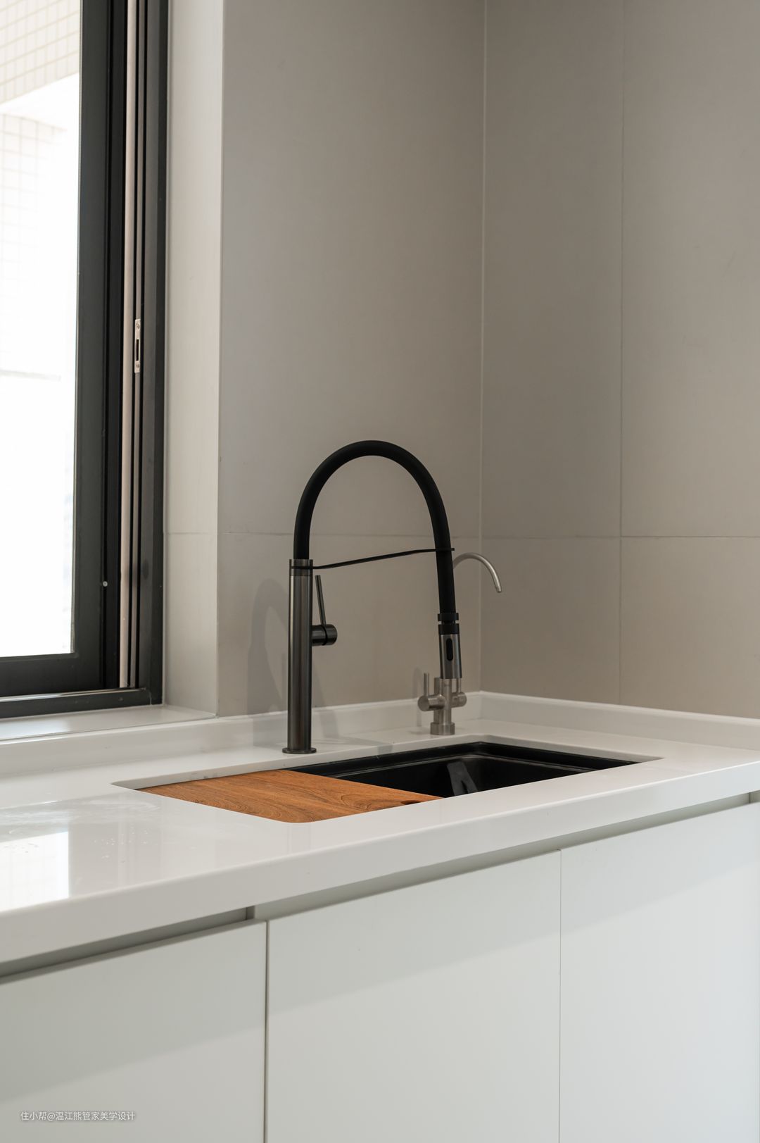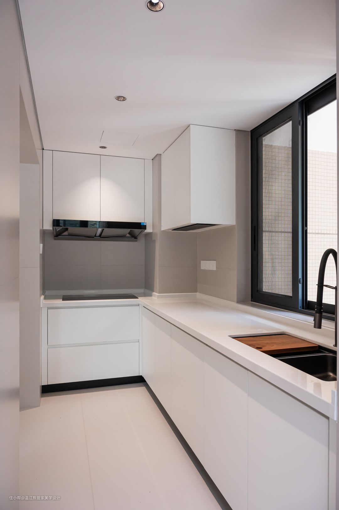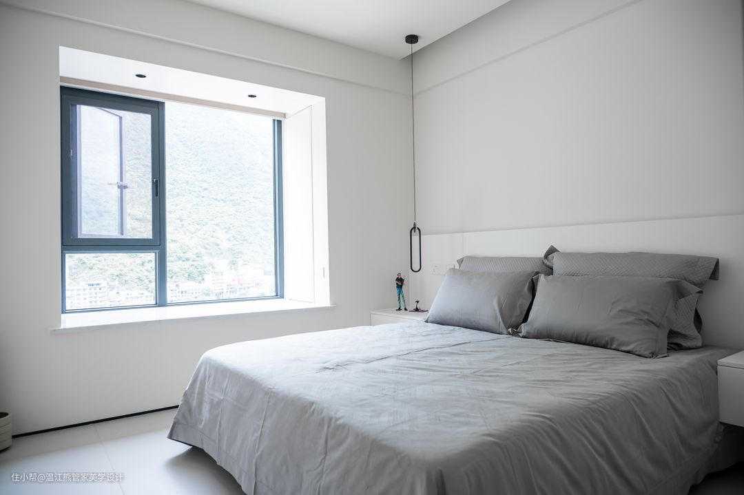 厨房位于客厅沙发的后方,隐形口袋门的设计让整体更加实用美观,需要隔绝油烟的时候关起来,不需要的时候打开,使厨房、客厅、餐厅完全连成一个整体,空间还是开放流通的; 口袋门两侧做了隐形储物柜,和墙面融为一体,美观又实用; 针对日常的烹饪习惯,中式厨房是一个不可或缺的空间,L型布局充分利用了空间,纯白色柜门延续客餐厅主色调,营造清爽的视觉感受; 厨房尽头零嵌冰箱,考虑到平时还有储存牛羊肉的需求,又多增加了一个冷冻冰箱的空间;升降式抽油烟机和小料台,让空间更显轻松治愈。