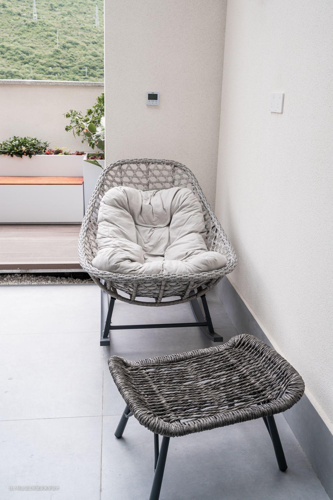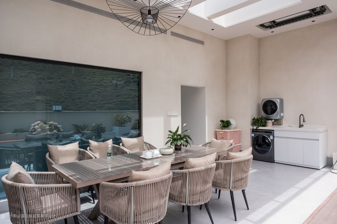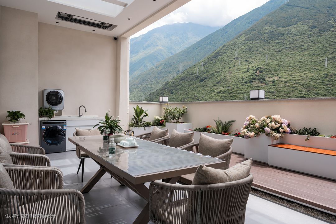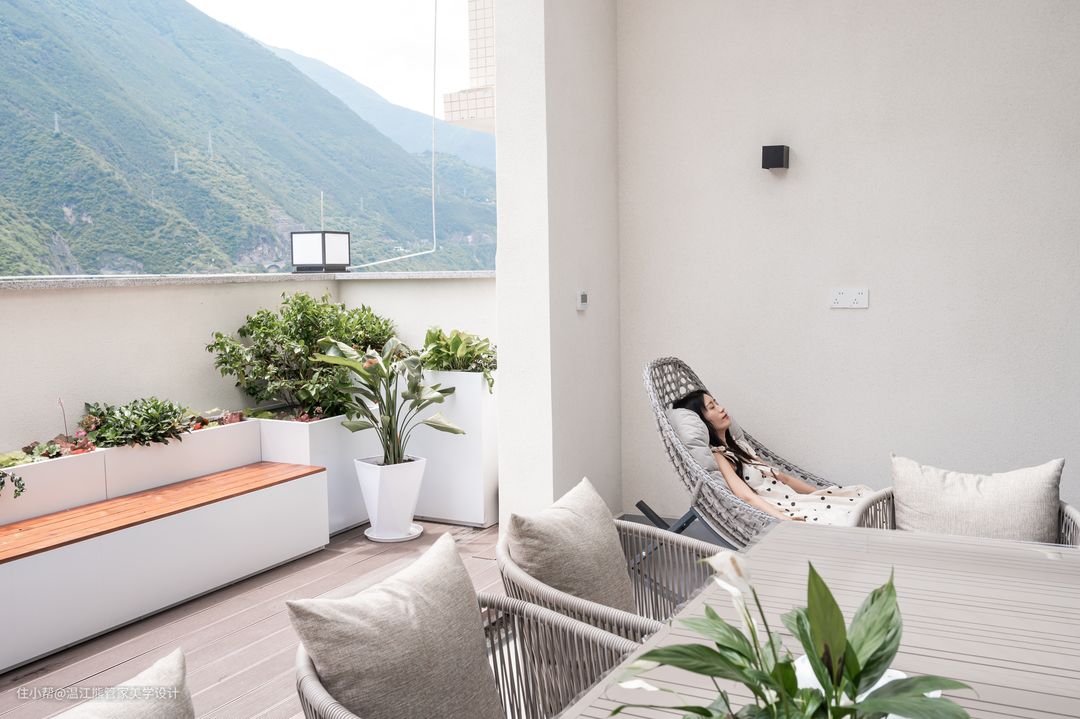 本案的露天阳台位于二楼,高低错落,线条干净简洁的花池和休闲茶台是空间的全部,与户外的自然氛围融合的刚刚好; 休闲茶台的头顶上方做了阳光棚,用来满足室内的功能,另一部分做成开放式花园,满足观赏和休闲的需要,打造格调清新的空间。