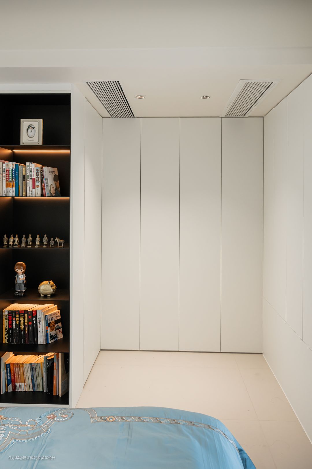 一楼和二楼都设定有卧室,一楼卧室隐藏在电视背景墙的后方,隐形门的设计与墙面色调一致,推开后又别有洞天; 二楼设立儿童房和书房,书房延续餐厅餐边柜的设计,开放式书架做了更多开放格用来放置图书摆件,简洁的线条勾勒出层次感; 卧室床头圆弧形设计,赋予家居更多灵气;两边床头上方都增加射灯,半夜起夜也不会因为灯光太亮晃眼睛; 床头对面设立小型衣帽间,衣柜u型设计,提供空间利用率。