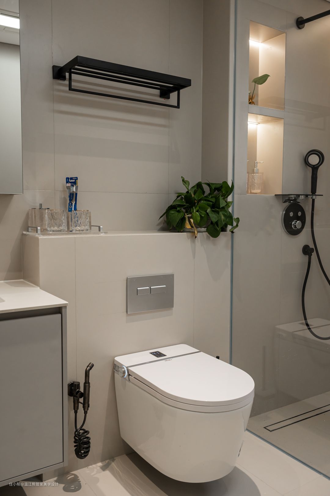干湿分离的设计,采用壁挂马桶和入墙式花洒,简洁清爽,没有卫生死角; 花洒上方做了内嵌式壁龛,深度大概30cm左右,即使是大瓶的洗发露也可以放得下;内嵌灯带,打造出放松舒适的淋浴环境.