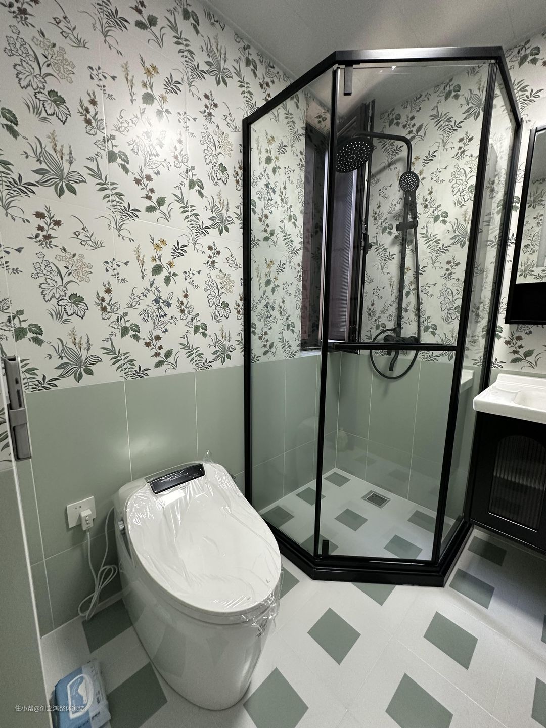 卫生间采用干湿分离设计,淋浴区和马桶还有洗手台隔离出来,墙面铺贴瓷砖做拼色设计,使用黄铜做点缀,突出整个卫浴空间的质感;
