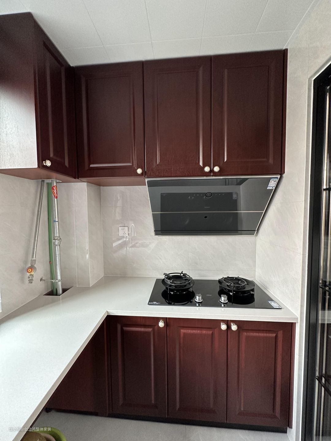 厨房空间比较狭长,因此选择做U字型布局,让厨房的功能性大大加强,有更多的空间储存更多的物品,厨房打造地柜和吊柜组合,实木家具和白色台面的组合,让下厨的空间也变得高级雅致;