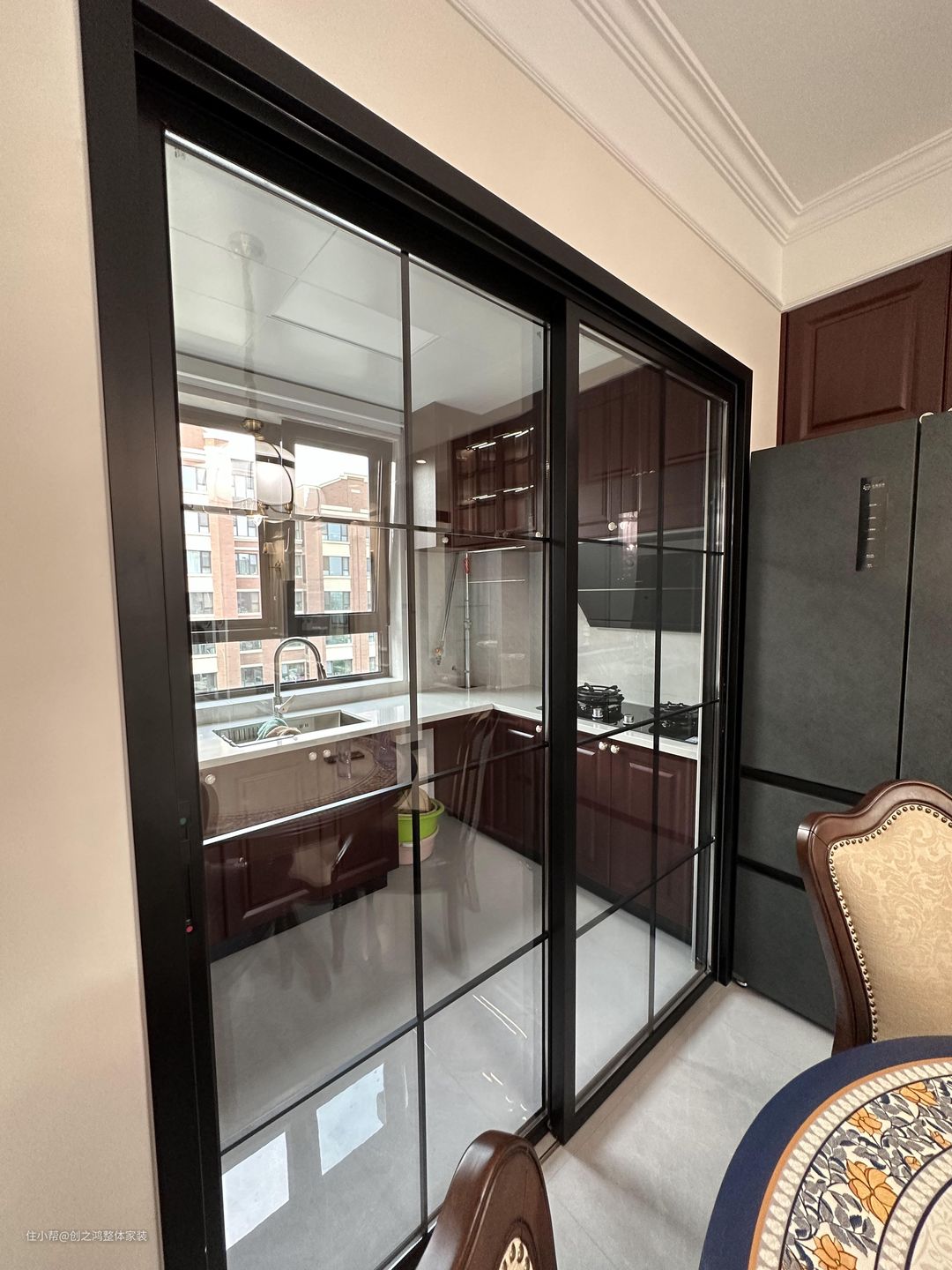 餐厅整体呈现出高雅舒适的气质,靠墙一侧定制通顶的餐边柜,将冰箱内嵌进去,为餐厅打造了充足的储物空间;业主为餐桌买了一个美式风情十足的桌布,让用餐氛围更加精致有仪式感; 餐桌上方垂落一盏吊灯,黄铜和亚克力的结合典雅高级,提升空间颜值!