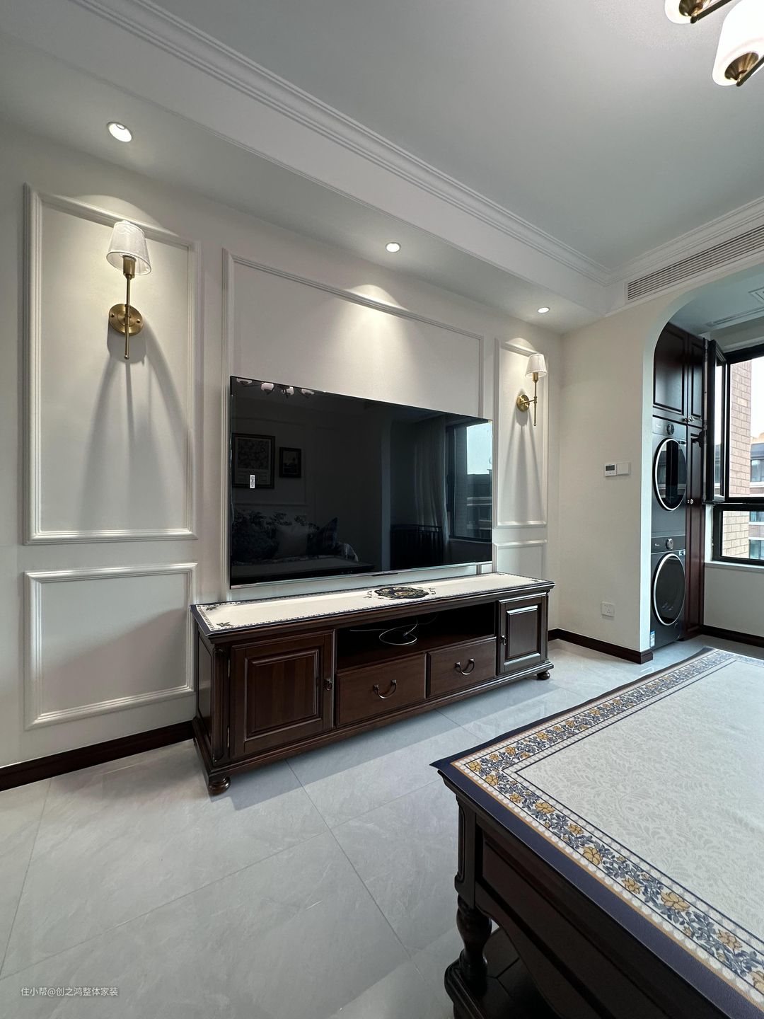 客厅的设计简洁不失典雅,墙面和地面采用浅灰色加可可蛋奶的组合,营造出干净明亮的氛围,吊顶做叠级造型,与石膏线背景墙形成呼应,彰显精致优雅的美式韵味! 沙发背景墙搭配装饰画,带有生动的个人烙印,彰显居住者对生活的热爱!