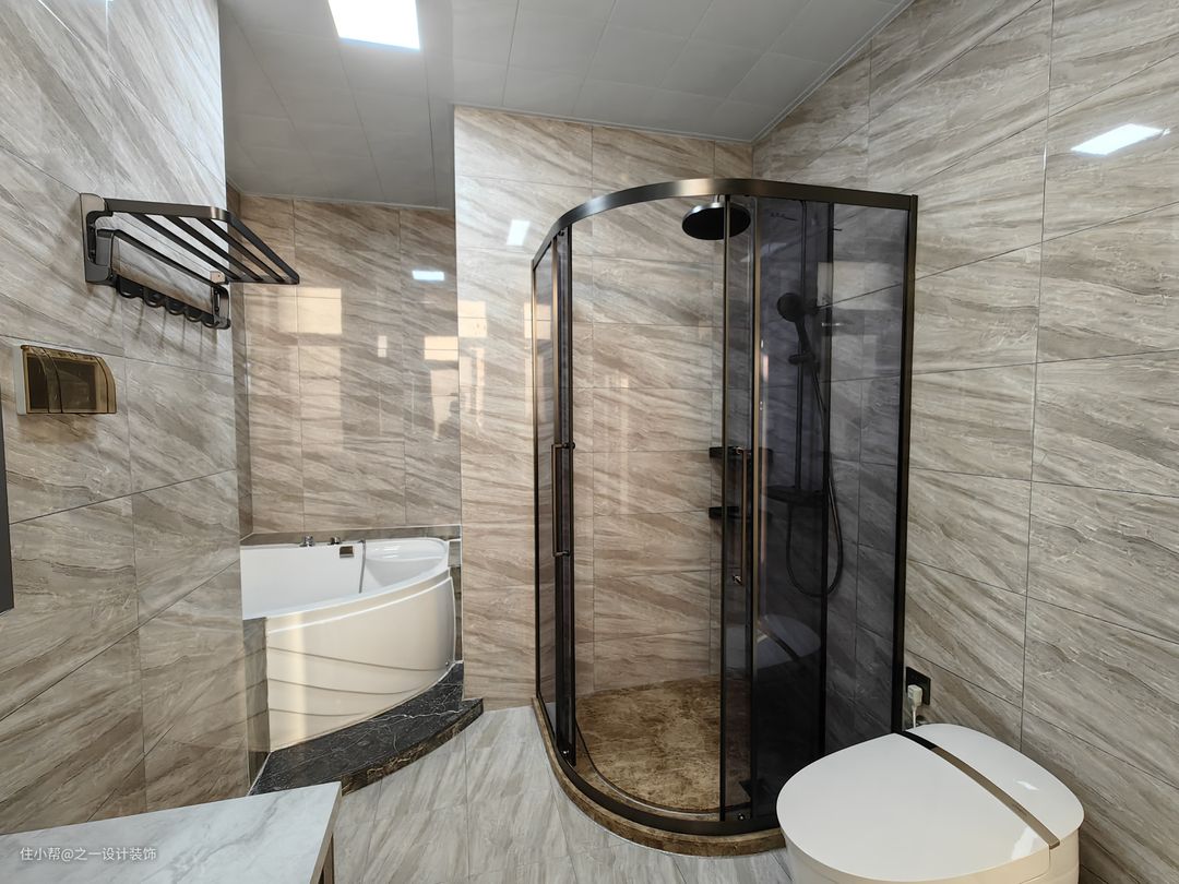 为满足业主浴缸需求,设计师把浴缸放置在一旁,充分利用空间,可以一边泡澡一边哼着小曲,悠然自得。还设计了一个淋浴区,用玻璃进行隔离,避免水花飞溅,卫生间墙面通铺灰色纹路瓷砖,显得非常的高级