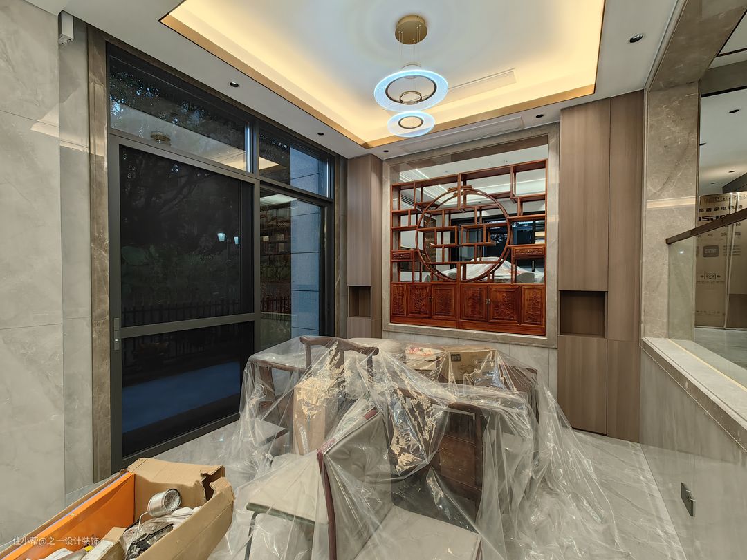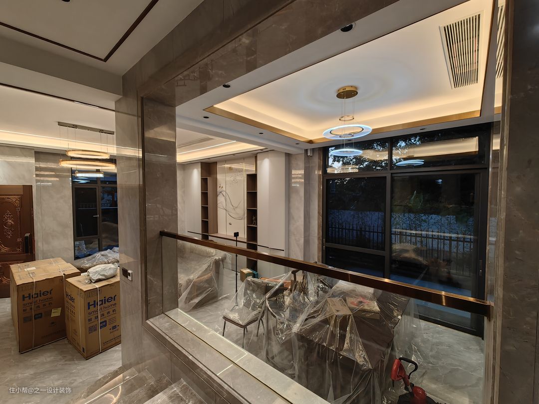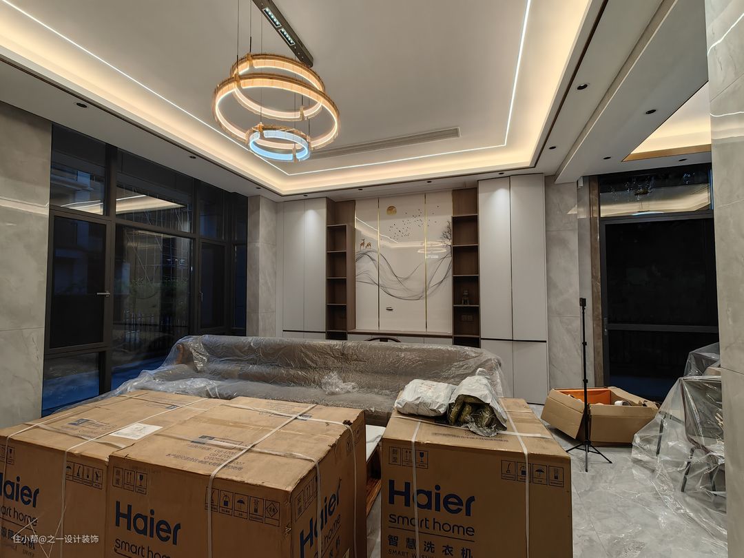客厅华美的装饰巧到好处,既古典而精致的韵味,毫不显刻板与落后,也富有轻奢高级感,它是所有顶级高贵品味的典范。业主新买的家电刚到,准备安装,客厅采用艺术氛围感很强的螺旋吊灯,衬托出整个客厅的高级奢华感,天花内嵌暖色的灯带,更加凸显家的环境优美