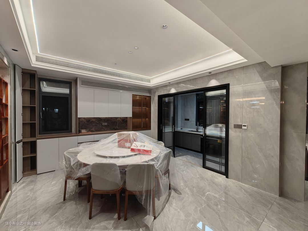 比较偏中式的餐厅,空间比较大,居中区域选择圆形的餐桌放置,餐桌旁定制满墙餐边柜,增加收纳空间,同时也能展示一些精美的餐具或装饰品;餐桌跟餐边柜门的颜色挑选一致,餐厅与厨房离的比较近,方便上菜