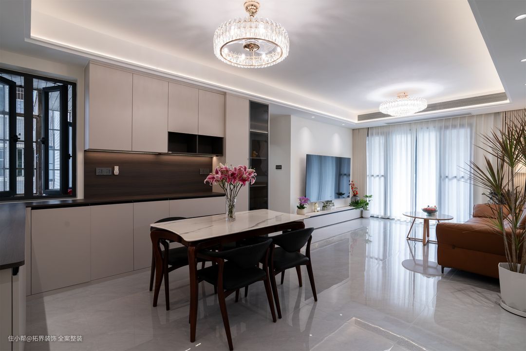 餐厅空间更注重简洁、大方、舒适的感觉,整体是偏中性的浅灰咖和黑木色,呈现了一个简单而不失高级感的用餐环境。