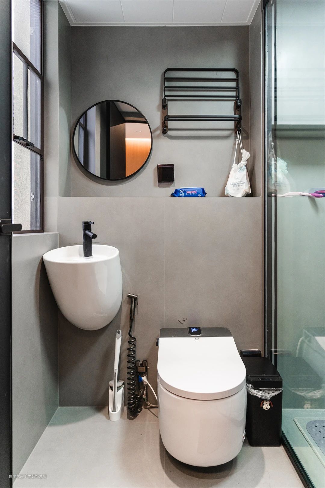 ▲ 卫生间实现干湿分离,灰色瓷砖营造简洁氛围。圆形镜子配白色水槽,展现洁净时尚感。长虹玻璃门隔绝水汽,健康舒适的洗漱环境。