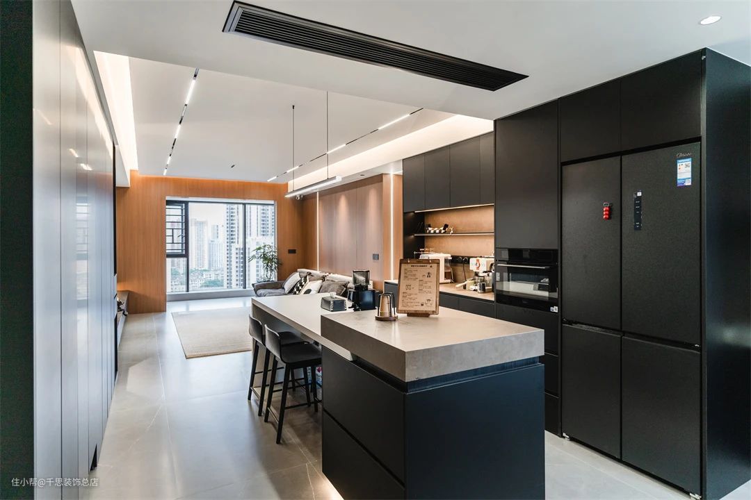 ▲ 整个客餐厅一体设计,餐桌衔接岛台,起到一个补充功能。色彩上将黑白诠释到极致。内嵌的冰箱严丝合缝,视觉效果直接拉满。