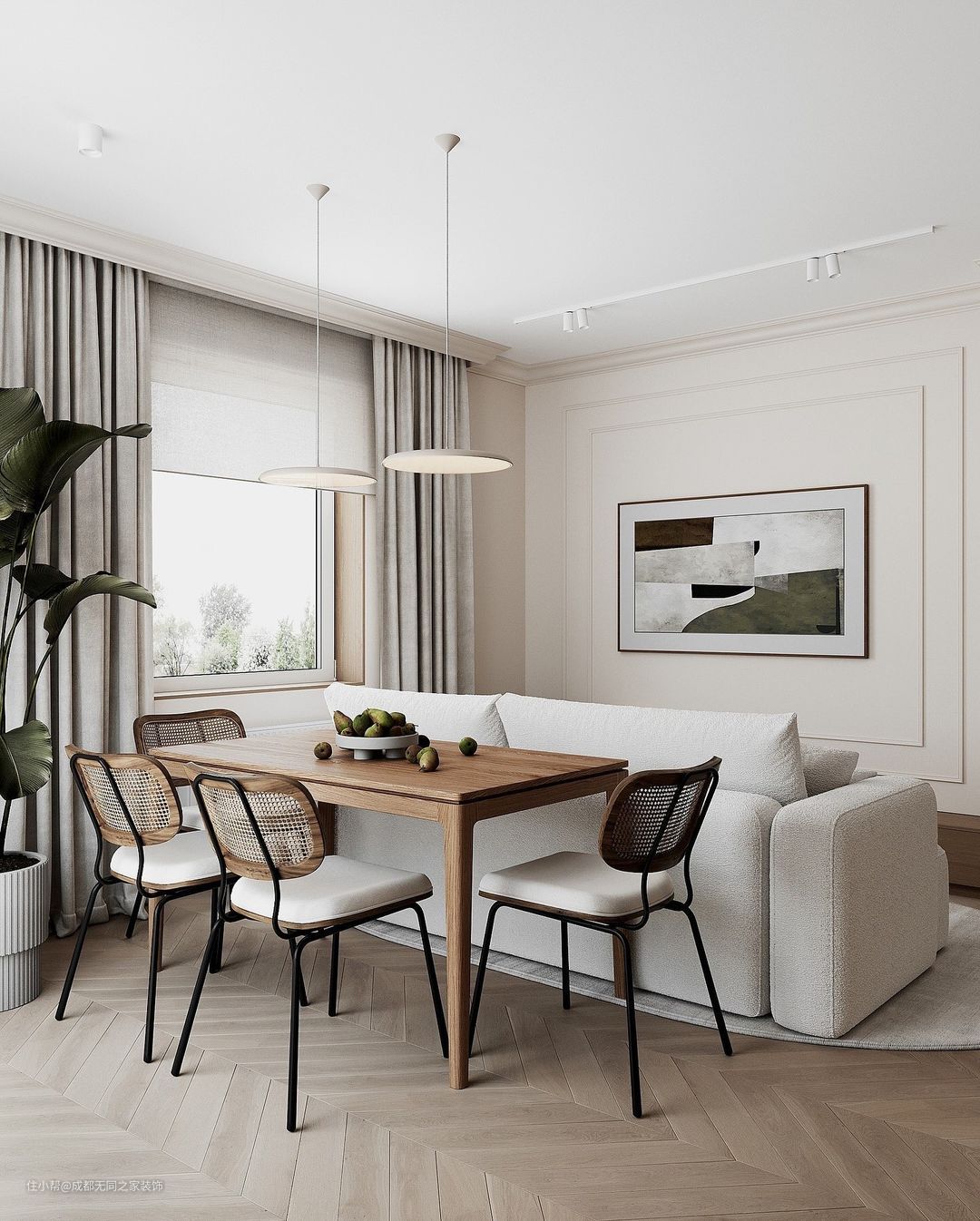 餐桌摆放在沙发后空地不能获取绝佳视野,简单木质长桌搭配藤编工艺靠椅,增加观赏感同事具备使用舒适性。由天花两盏垂钓灯提供照明。