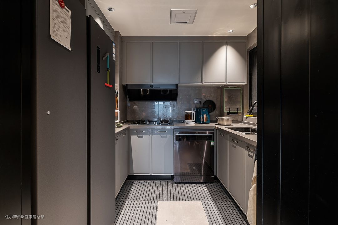 调整了厨房户型后,做了U型的橱柜布局,把洗菜备菜和烹饪区划分开,保证空间的动线合理。而且橱柜都做了抬高,更符合人体工学,做饭不易累腰。 侧边将冰箱嵌入到橱柜,将空间都有效利用起来。墙面上方的空间也没有浪费,都做满了吊柜增加收纳,无把手的设计,也不易磕碰。